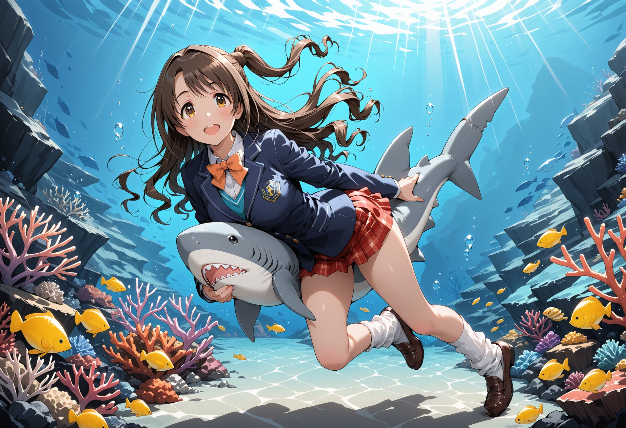 High resolution, Super detailed, Best Quality, masterpiece, 8K, 4K, beautiful background, the best aesthetics, underwater, BREAK , 1 girl, Shimamura Uzuki, The Idolmaster Cinderella Girls,yellow eyes,brown hair, uniform blazer, loose white socks,full body,swimming wear loafers , hold baby shark, BREAK , surrounded by tropical fish, coral reef, bubbles, underwater scene, diffused sunlight, caustics, bluish tint, soft shadows, slightly desaturated colors, underwater haze, floating particles, subsurface scattering, refracted light, soft contrast, natural lighting,
