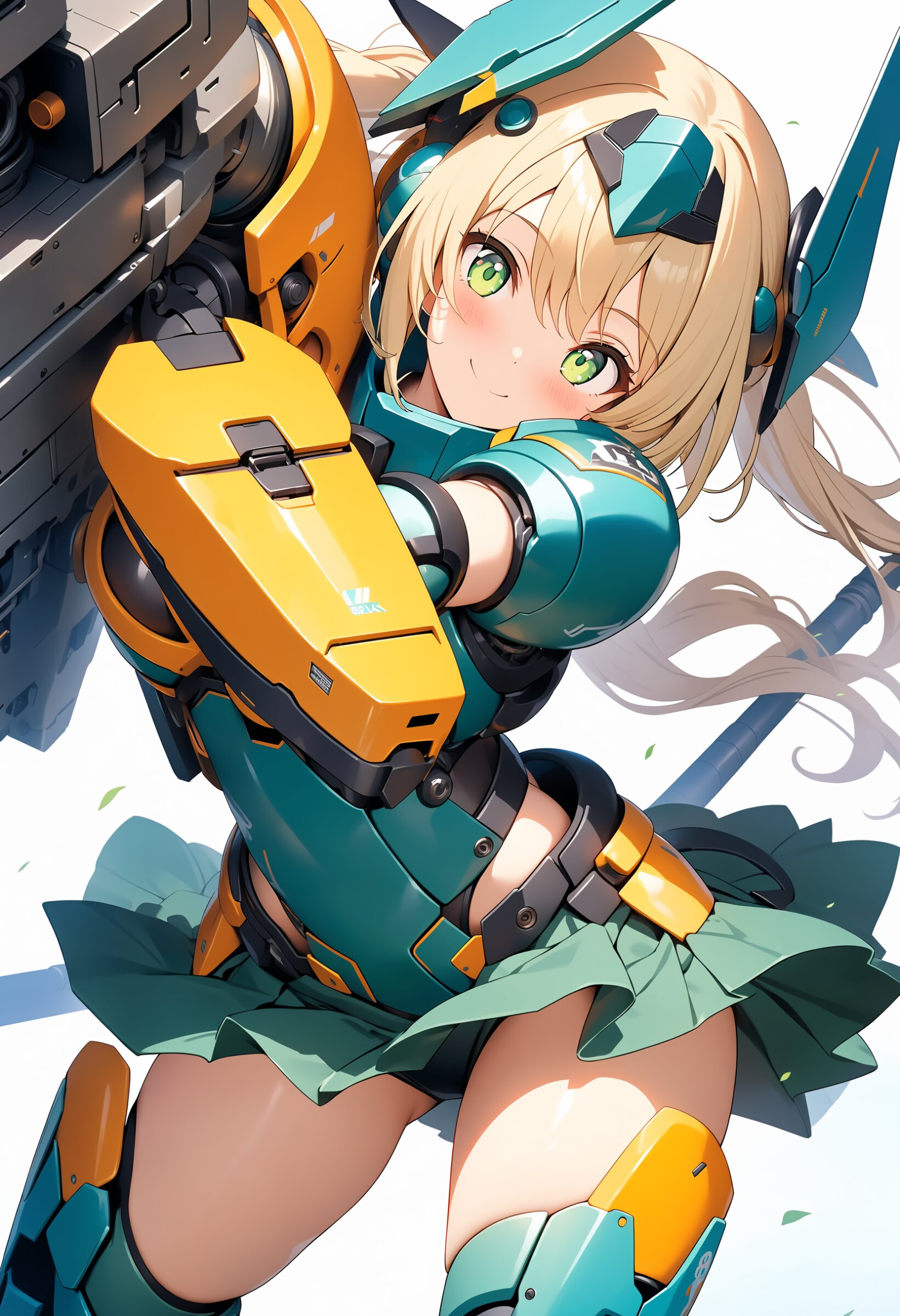 1girl, ((white background)), ultra detailed 8k cg render, masterpiece, high resolution, extremely detailed, mecha musume,mecha shoulder, mech leg, headgear, mecha armor, ((mini skirt)),long blonde hair, dropping green eyes, smile, dynamic posing,