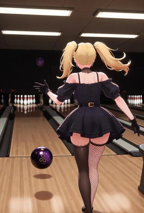 ボールがピンに向かって転がっていき、すべてのピンが倒れてストライクになったあと、Aniは振り返って会心の笑顔と喜びのポーズを見せる。