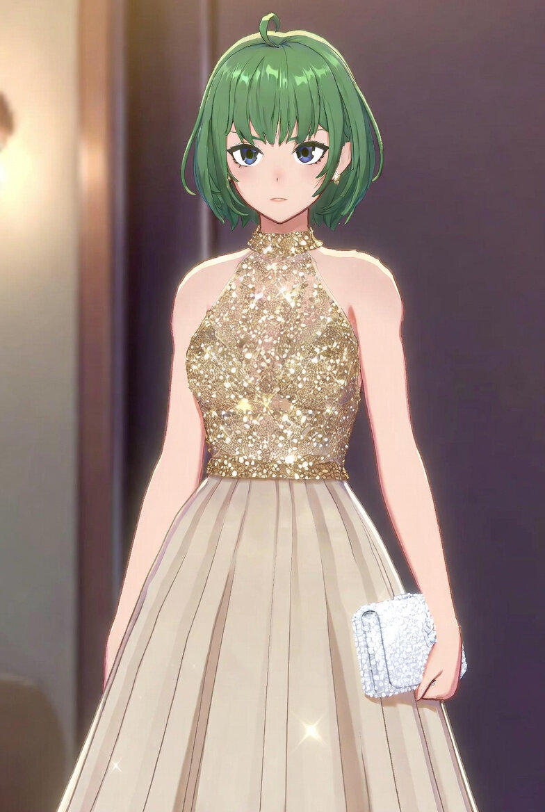 イラスト: 20歳ガール,green hair,light green eyes,blunt bangs,ahoge,short hair,straight hair,hime cut,delicate face,delicate hair,beautifully detailed hair,defined detailed face,beautiful detailed eyes,beautiful detailed eyes,catchlight in eyes. elegant makeup, and subtle earrings, posing gracefully in a high-neck halter evening gown featuring a sparkling gold sequin bodice with intricate beadwork and a flowing light champagne satin skirt that reaches the floor in an A-line silhouette. She holds a small white beaded clutch in one hand. The background is ホテルの通路. Full-body shot.