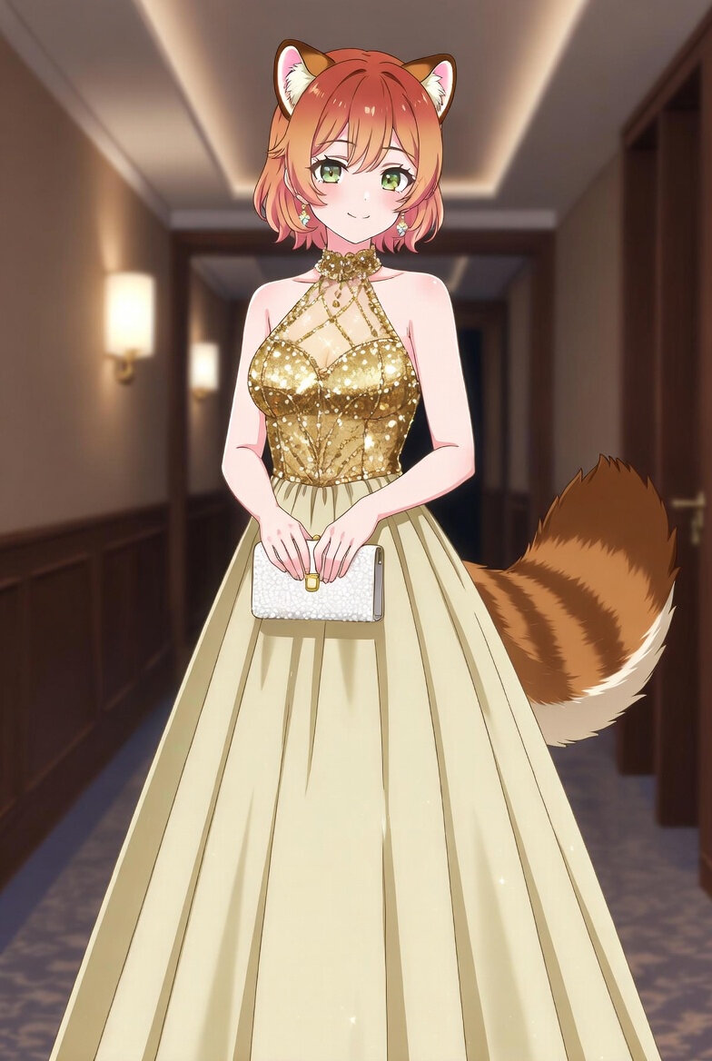 イラスト: 20歳女性,kawaii,flat chest,小さなバスト,(light red short bob hair:1.4),simply,fluffy tanuki ears and large fluffy tail spreading naturally behind her,green eyes, elegant makeup, and subtle earrings, posing gracefully in a high-neck halter evening gown featuring a sparkling gold sequin bodice with intricate beadwork and a flowing light champagne satin skirt that reaches the floor in an A-line silhouette. She holds a small white beaded clutch in one hand. The background is ホテルの通路. Full-body shot.