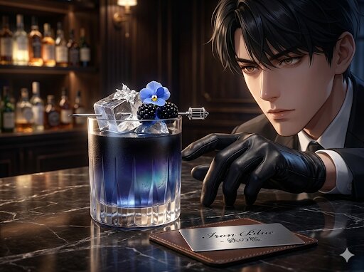 彼の瞳の色と、鉄格子の冷たさをイメージしたオリジナルカクテル『Iron Blue -鉄の檻-』を。