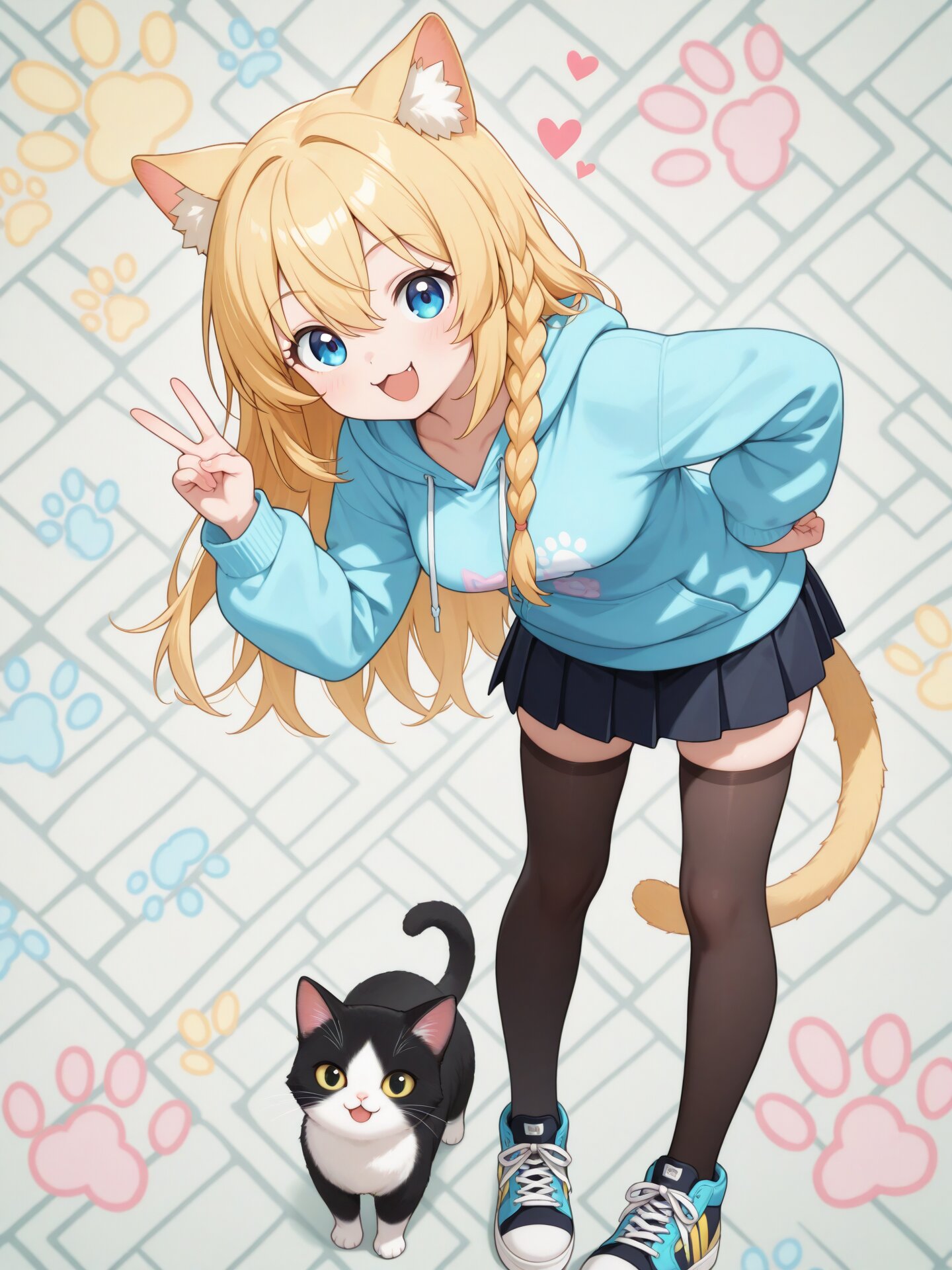 anime style, high quality illustration, detailed shading, 1girl, long hair, golden blonde hair, braided hair, braid, hair between eyes, blue eyes, fluffy cat ears, bright cheerful expression, :3, open mouth, big smile, teasing look, slim body, soft feminine curves, medium, short pleated skirt, hoodie, black thigh-high stockings, casual sneakers, dynamic playful pose, slightly leaning forward, one hand raised near face making a peace sign, holding cat, cute cat beside her, friendly interaction with a cat, tail gently curved, ears perked up, paw stamp, bright and colorful background, light blue and pastel tones, cheerful and cute background design, soft lighting, energetic and cute mood, clean composition, face focus,