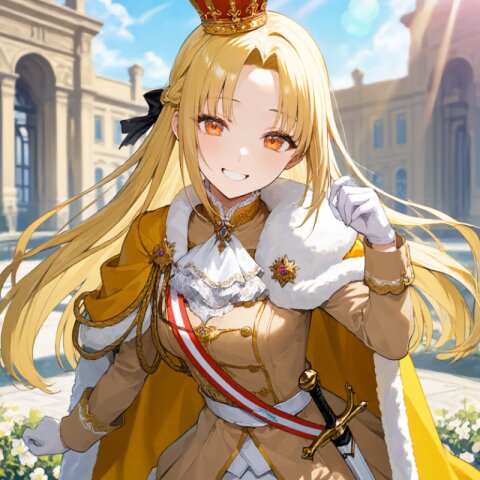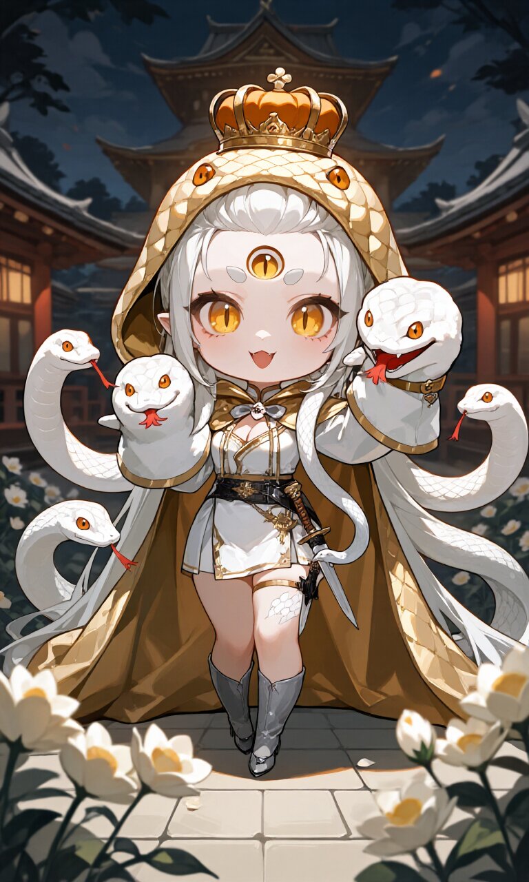 A (chibi:1.3) girl with a mystical and spiritual aura, featuring a golden third eye on her forehead and long, shimmery white snake-like hair flowing down to her waist. Her hair is styled in a center-parted, slicked-back look with two long bangs shaped like sharp fangs. She has big, round golden eyes with slit pupils, slightly sharp fangs, and (round eyebrows:1.2). Her skin is fair with subtle scaly textures, and she wears a (Gold snake head hood:1.7) with a luxurious (gold and silver snake hood). She dons a (White luxurious Prince costume:1.6) with long sleeves past her wrists, a (luxurious Gold Cape:1.3), and a (luxurious Silver mini skirt:1.4). A (dagger on waist:1.3) and a (luxurious crown on head:1.4) complete her royal attire. Her (Fluffy gloves with Snake characters:1.2) include a (hand puppet shaped like a snake's head:1.2). The setting is a Japanese Palace with traditional architecture, surrounded by flowers at midnight. The dim lighting and darkness create a romantic, academic atmosphere with a touch of gloom. Her expression is happy and cheerful, with a cute face and pose, embodying Prince Charming’s charm. The artwork is insanely detailed, with delicate facial features, intricate clothing, and a masterpiece-quality 16K finish.