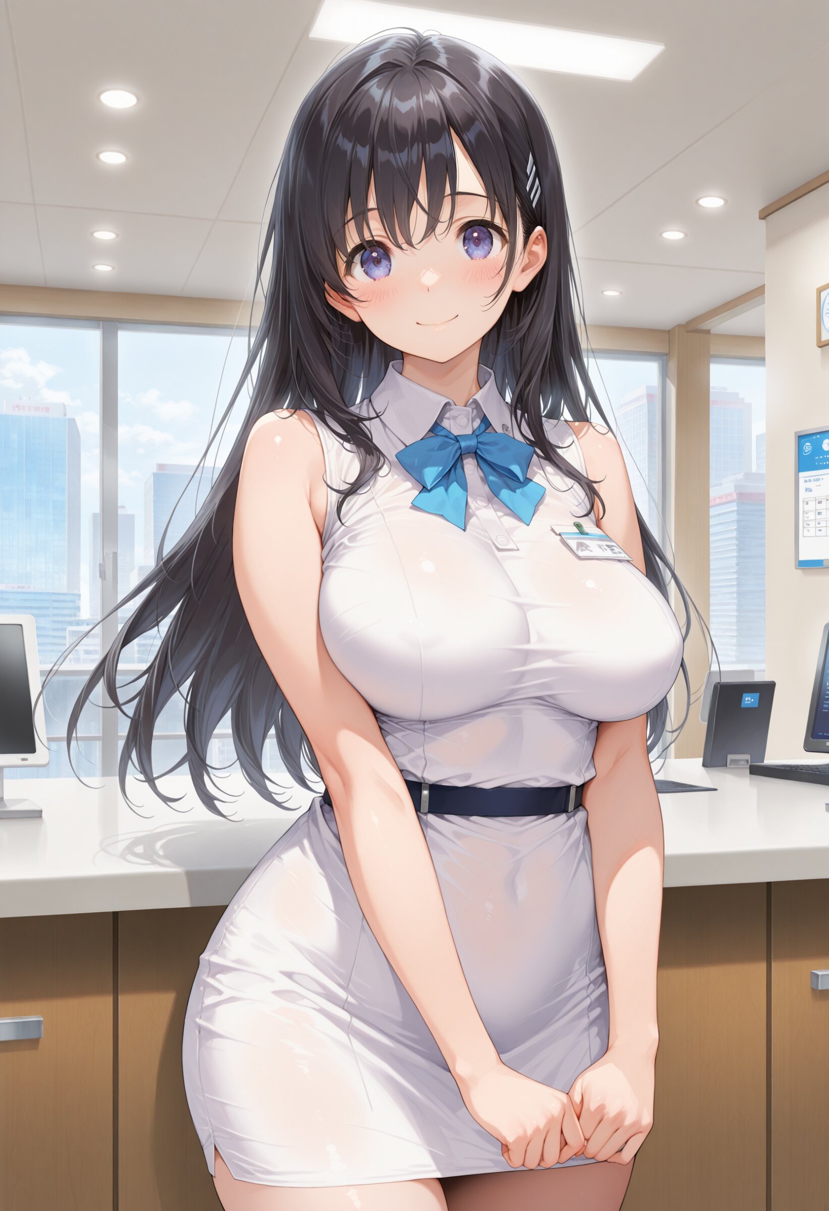 masterpiece, best quality, amazing quality, general, fine detail, official art, 1girl, petite, female Office building receptionist, beautiful black hair, white tube dress, perfect fit, blue ribbon, beautiful eyes, big breasts, impossible clothes, perky breasts, happy, , innocent expression, cowboy shot, in hotel, service counter,
