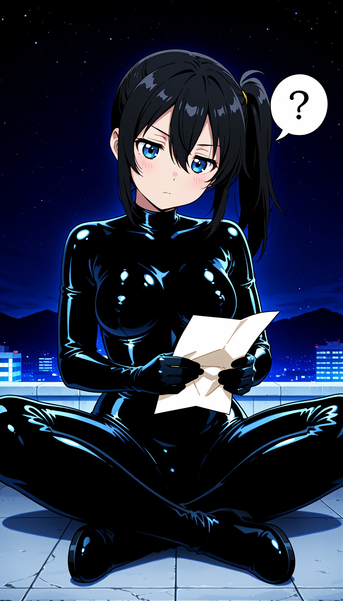 <lora:MeMax6-noob-vpred:1>,memaxl6_a,memaxl6_b,memaxl6_c,memaxl6_d,memaxl6_e, Full HD,32K, 1girl, (solo), (from front), medium breasts, (teenage :1.3), (blue eyes), long hair, (((side ponytail))):2.0, (((sideburns))), (((hair between eyes))), (((tareme))), (((black hair))), (beautiful hair), (shiny hair), (medium breasts), slender, blush, shiny clothes:1.8, ((((((black latex bodysuit:1.4)))))), ((black latex clothes:2.0)), (((skin tight))) ,(((tight clothes))), ((((seamless clothes)))):2.0, ((((((((shiny black latex bodysuit, shiny clothes, )))))))), ((black latex gloves)),((((no zippers)))), (covered nipples:1.6), erectile nipples, black latex boots, (expressionless, jitome, v-shaped eyebrow, head tilt, spoken question mark), looking down, (sitting on floor, indian style), (holding paper:1.2, map), (night, outdoors, rooftop, ), natural lighting:1.5, (high contrast):2.8, lighting behind, anime, anime screencap, no gradients, 2D flat design, bold outlines, Full HD,32K,masterpiece,best quality, super fine illustration, very aesthetic, absurdres, newest, hyper detailed, intricate, beautiful, aesthetic, highly decorative, HDR, yume kawaii,