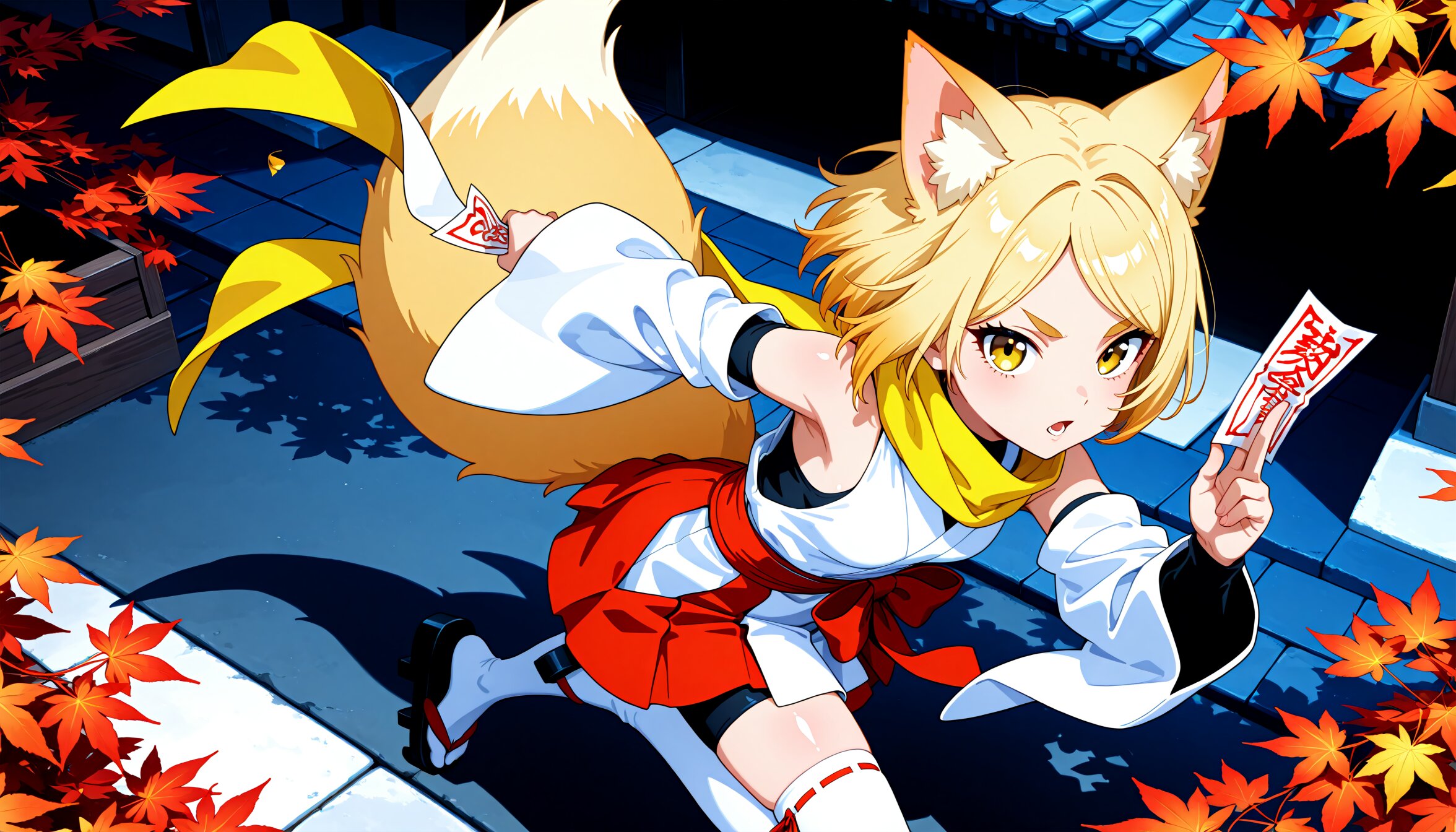 <lora:MeMax6-noob-vpred:1>,memaxl6_a,memaxl6_b,memaxl6_c,memaxl6_d,memaxl6_e, Full HD,32K, 1girl, (solo), (face focus, portrait):1.8, small breasts, (teenage:1.8), small breasts, (teenage:1.8), shiny skin, (slender), fox ears, fox tail, mysterious, red bowtie, (shiny hair, short hair, blonde hair), swept bangs, (parted bangs), thick eyebrows, yellow eyes, (tsurime), (white miko), (red hakama short skirt:1.8), (armpit), japanese clothes, white thighhighs, (black undershirt, long sleeves), bike shorts, geta, (yellow scarf), kunoichi, holding ofuda, (expressionless), ((looking at viewer)), (running), (v-shaped eyebrows), open mouth, from side, (from above), dynamic angle, (wind, autumn leaves), anime, anime screencap, no gradients, 2D flat design, bold outlines, Full HD,32K,masterpiece,best quality, super fine illustration, very aesthetic, absurdres, newest, hyper detailed, intricate, beautiful, aesthetic, highly decorative, HDR, yume kawaii,