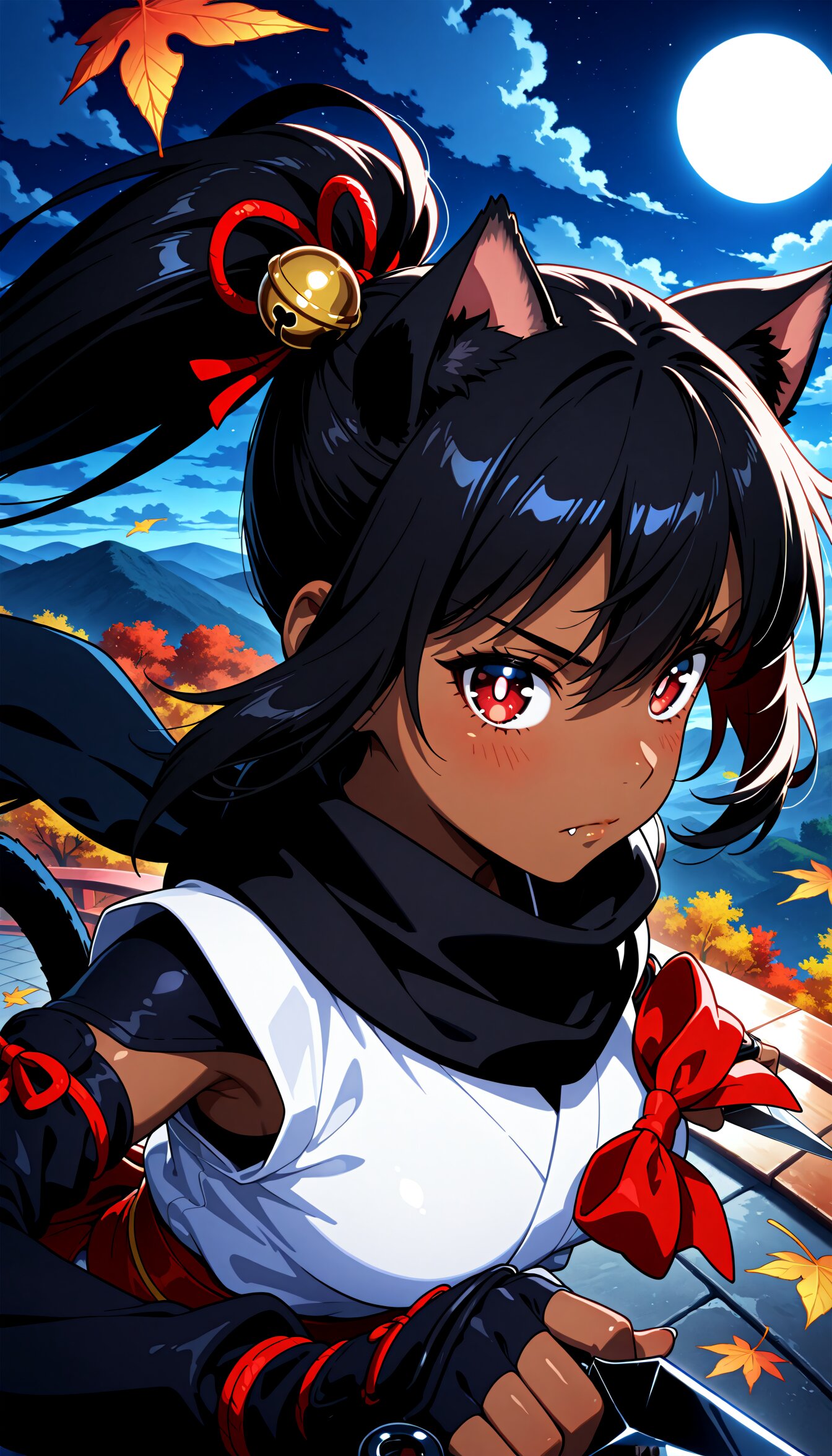 <lora:MeMax6-noob-vpred:1>,memaxl6_a,memaxl6_b,memaxl6_c,memaxl6_d,memaxl6_e, Full HD,32K, 1girl, (solo), very dark skin, (face focus, portrait):1.8, medium breasts, shiny skin, (slender), (teenage :1.8), (hair ornament, hair bell, heir ribbon), miko, (armpit), japanese clothes, clothing cutout, (black undershirt, long sleeves), (red bowtie), (kunoichi), (black scarf), holding weapon, kunai, tsurime, medium breast, beautiful hair, shiny hair, (black hair, very long hair, ponytail), (red eyes:2.0), sidelocks, choppy bangs, cat ears, cat tail, shaped pupils, white pupils, fangs, shiny skin, faint lips, blush, (expressionless), (looking at viewer), (running, forward-bent posture), (v-shaped eyebrows), closed mouth, from side, (from above), dynamic angle, (wind, autumn leaves), (autumn, night, moon, cloud,), natural lighting, high contrast scale:10, anime, anime screencap, no gradients, 2D flat design, bold outlines, Full HD,32K,masterpiece,best quality, super fine illustration, very aesthetic, absurdres, newest, hyper detailed, intricate, beautiful, aesthetic, highly decorative, HDR, yume kawaii,