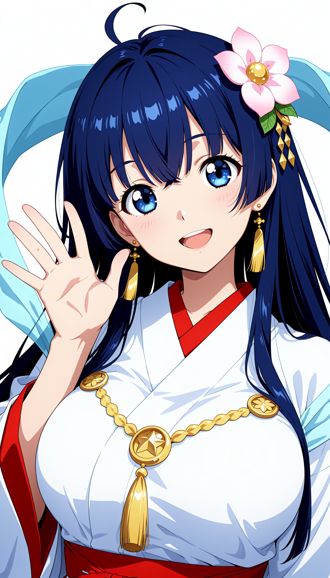 <lora:MeMax6-noob-vpred:1>,memaxl6_a,memaxl6_b,memaxl6_c,memaxl6_d,memaxl6_e, Full HD,32K, 1girl, solo, portrait, (smile), (looking at viewer, head tilt, ), open mouth, waving arm, (teenage :1.3), (large breast), (slender):1.2, (tareme):1.2, beautiful hair, shiny hair, straight hair, (dark-navy blue hair):1.2, crossed bangs, (hime cut, long hair):1.1, ahoge, dark-blue eyes, (Celestial Maiden:1.8), (japanese clothes, flower hair ornament, red-white miko:1.1, long sleeves, tassel earrings), (light-blue hagoromo):1.3, (simple background, white background), masterpiece, best quality, super fine illustration, very aesthetic, newest, hyper detailed, intricate, beautiful, aesthetic, highly decorative, HDR, yume kawaii, ,anime screencap,anime,no gradients, 2D flat design, bold outlines, 10's anime style,