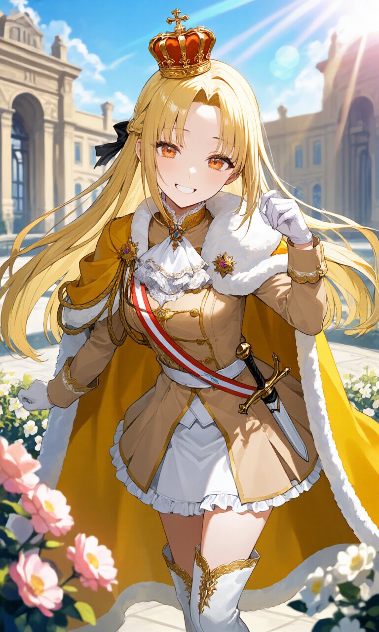 A stunningly detailed portrayal of a young woman with long, straight blonde hair featuring (center parted bangs:2.0) and (long bangs:1.5), framing her delicate face with a (forehead:3.0) emphasis. Her amber eyes are beautifully rendered with intricate catchlights, radiating warmth and cheerfulness. She wears a (Beige luxurious Prince costume:1.4) with long sleeves, a white lace jabot, and a (luxurious Yellow Cape:1.3) draped elegantly over her shoulders. The outfit includes a (luxurious White mini skirt with frills:1.4), (White luxurious boots:1.3), and pristine white gloves. A (Dagger on waist:1.2) adds a regal touch, while a (luxurious crown on head:1.3) completes her princely attire. She stands in a grand Palace courtyard with Rococo architecture, surrounded by blooming flowers under the soft afternoon sunlight. The blue sky is streaked with golden sunbeams, lens flares enhancing the romantic academia atmosphere. Her pose is playful and cute, grinning with infectious joy, embodying the charm of a fairytale Prince Charming. Every detail—from her intricately styled hair to the delicate embroidery on her clothes—is masterfully crafted, creating an insanely detailed 16K masterpiece.