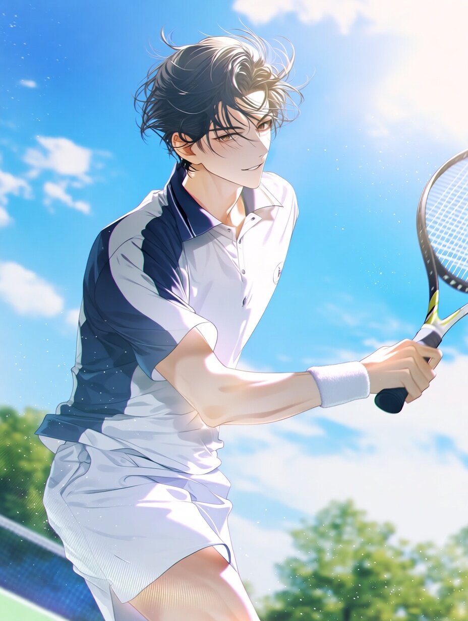 (masterpiece, best quality, highres, 8k wallpaper:1.2), extremely detailed, (ultra-detailed eyes, sparkling eyes:1.1), (soft lustrous skin),1boy, breathtakingly handsome young Japanese man**, athletic yet elegant build, perfectly balanced proportions,dark slightly tousled black hair swept back**, a few loose strands falling naturally across his forehead, subtle movement from the wind,long eyelashes**,pale brown eyes with a quiet, melancholic glow**, refined facial features, elegant jawline, smooth pale skin, calm and introspective expression softened by a faint relaxed smile, enjoying the moment, wearing astylish tennis outfit**, modern and clean design, fitted athletic shirt and shorts, refined color palette (white, navy, or soft gray), wristband and tennis racket held lightly yet confidently, capturedmid-rally while playing tennis**, graceful footwork, fluid swing, perfect form, relaxed shoulders, sense of ease and enjoyment rather than competition, (cinematic lighting), soft focus, tyndall effect, bloom, bright natural daylight illuminating his figure, gentle rim lighting outlining hair and body, (glowing light:0.8), dynamic angle, depth of field, rule of thirds,outdoor tennis court background**, vivid blue sky, soft clouds, green trees beyond the court, court lines slightly blurred by motion, dust and light particles sparkling in the air, transparent summer atmosphere, serene and emotional sports moment, youth and quiet passion, clean and sharp line art emphasized, highly polished commercial illustration, cinematic composition