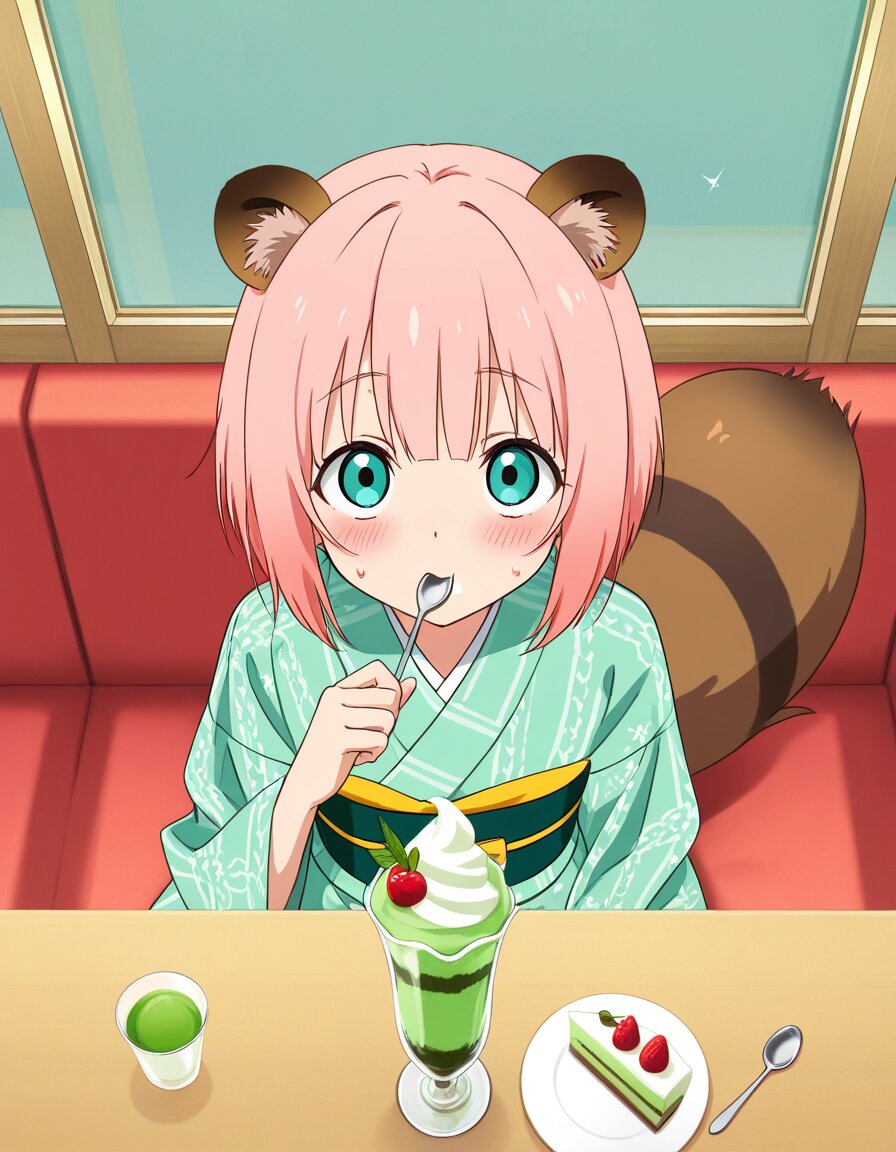 masterpiece, best quality, absurdres, very aesthetic, highres, 1girl, solo, flat chest, petite, slim, light red short bob hair, pastel red hair, mint green pastel kimono, modern style kimono, subtle asanoha geometric patterns, deep navy obi, thin silver line on obi, simple obi tie, fluffy tanuki ears, large fluffy tanuki tail, bushy tail spread naturally behind, eating matcha parfait, spoon in hand, matcha parfait spoon in mouth, cream on lips, green tea ice cream, red bean, whipped cream, matcha sauce dripping, wide eyes, surprised expression, flustered, slightly panicked, looking up at viewer, looking up, high angle, slightly overhead view, from above, blush, sweatdrop, caught in the act, cute embarrassed face, detailed face, detailed eyes, soft eyes, subdued eye highlights, minimal eye sparkle, gentle lighting, no dramatic eye shine, soft shading, indoors, japanese cafe interior, low table, parfait glass with steam lightly, dynamic pose, anime coloring, detailed food texture, intricate parfait layers