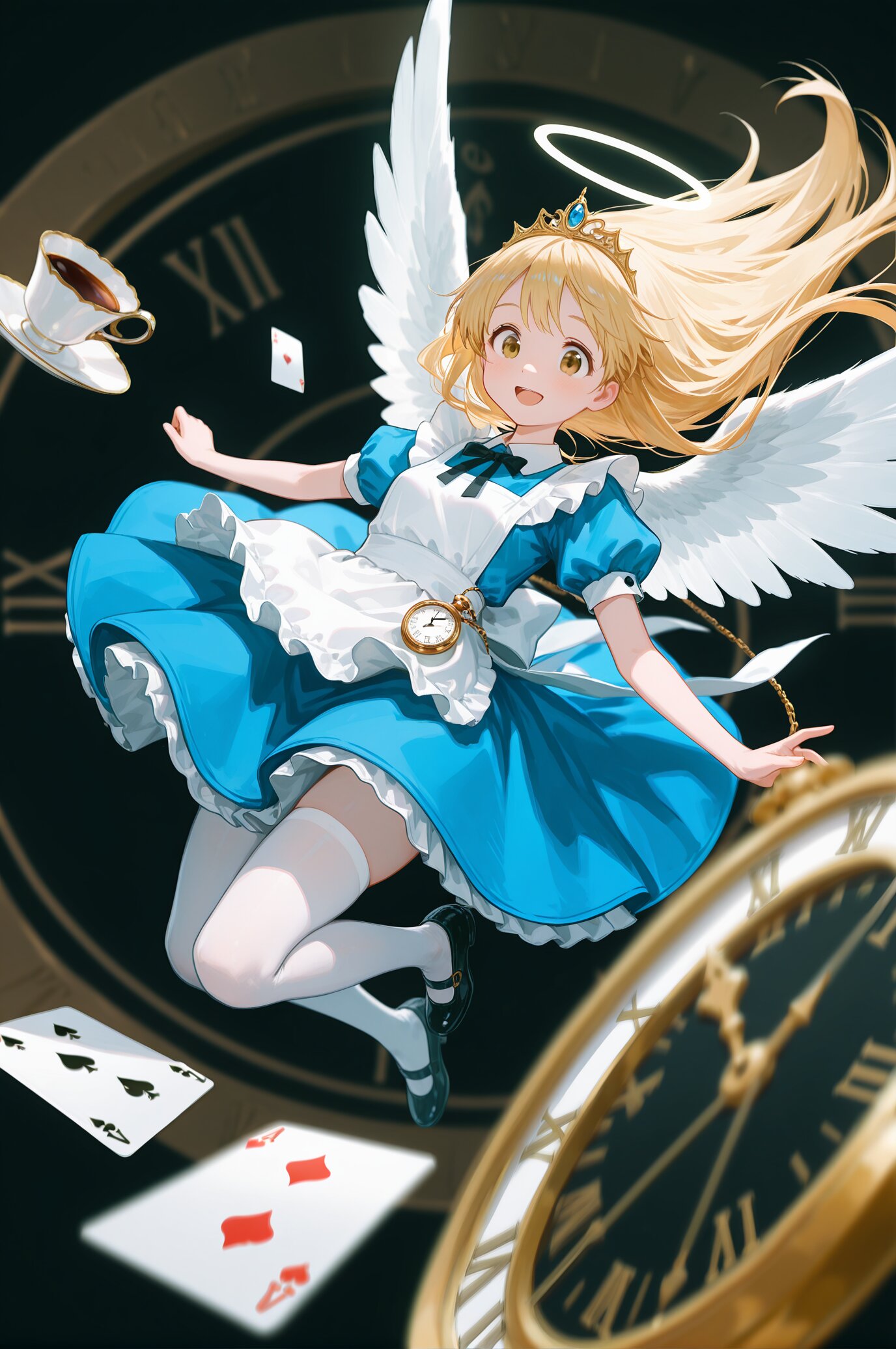 masterpiece, best quality, absurdres, 8k, ultra detailed, aesthetic, very aesthetic, newest, <lora:Fixhands_anime_bdsqlsz_V1:0.5>, <lora:bold-16oa:-0.5>, (realistic:0.3),BREAK (shallow depth of field,Gaussian Blur:1.6),1girl,alice_in_wonderland, 1girl, young_girl, cute,blonde hair, long hair, straight hair,brown eyes, tareme,happy,smile,open mouth,white angel wings,(tiara,round_face, chibi_proportions:1.2),halo,falling, midair, looking_down, surprised_expression, gentle_smile,blonde_hair, shoulder_length_hair, blue_dress, white_apron, puff_sleeves,knee_length_dress, white_stockings, black_shoes,giant_rabbit_hole, distorted_perspective, spiral_composition,floating_objects, floating_clock, floating_teacup, floating_playing_cards,old_key, pocket_watch,fantasy, whimsical, magical, colorful, pastel_colors,dark_void_background, glowing_edges, soft_light, fantasy_lighting,sense_of_motion, dynamic_pose, dynamic_angle,(tareme,small breasts,curvy:1.2),<lora:USNR STYLE_XL_loha:0.8> ,black hair,