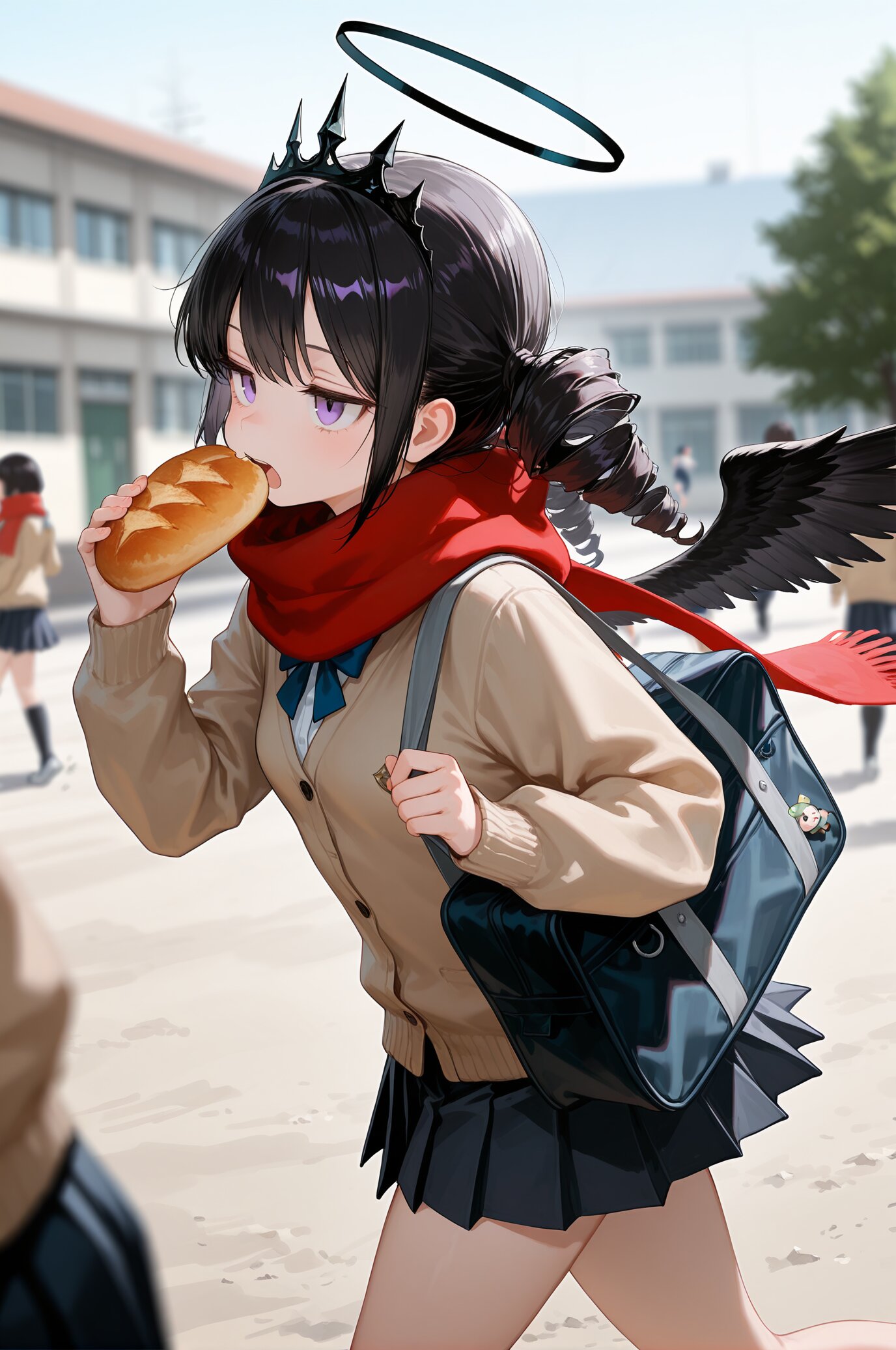 masterpiece, best quality, absurdres, 8k, ultra detailed, aesthetic, very aesthetic, newest, <lora:Fixhands_anime_bdsqlsz_V1:0.5>, <lora:bold-16oa:-0.5>, (realistic:0.3),BREAK (shallow depth of field,Gaussian Blur:1.6),1girl,outdoors,school yard,ground,school building,student,side view,(schoolyard,school building, (tree:0.8):1.0),(other students,students:1.3),black twin drill hair, purple eyes, jitome,expressionless,(tiara, black wings folded behind,jitome:1.1),black halo,small breasts,school uniform,red scarf,beige cardigan,pleated skirt,(running:1.5),eating bread,open mouth,school bag, (cowboy shot,wide shot,wide angle:1.1),(small breasts,curvy:1.3),(motion blur:1.1),<lora:USNR STYLE_XL_loha:0.8>,black hair,
