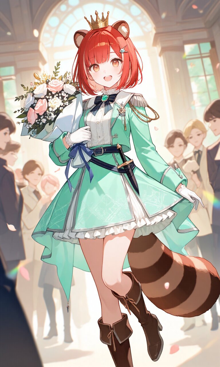 A 20-year-old girl with (light red short bob hair:1.4), big round eyes, and a cute, detailed face stands confidently in a luxurious ballroom. She wears a (modern style mint green pastel luxurious Prince costume with subtle asanoha geometric patterns:1.5), featuring long sleeves, a (luxurious mini skirt with white frill:1.3), and a deep navy belt with thin silver lining. Completing her princely attire are (brown luxurious short boots:1.3), a (dagger on waist:1.3), a (luxurious crown on head:1.3), and (luxurious white gloves:1.2). Fluffy tanuki ears perk up atop her head, while a naturally spreading fluffy tail peeks from under her skirt. She holds a (bouquet in hand:1.5), smiling happily among (surrounded by friends:1.8) in a heartwarming birthday scene. The setting is a (Japanese Palace:1.2) with traditional architecture, dreamy soft lighting, and a romantic academia atmosphere. The air is filled with lots of flowers, soft pastel tones, and a cozy, light ambiance. Masterfully detailed skin, hair, and fabric textures enhance the insanely detailed 16K masterpiece quality.