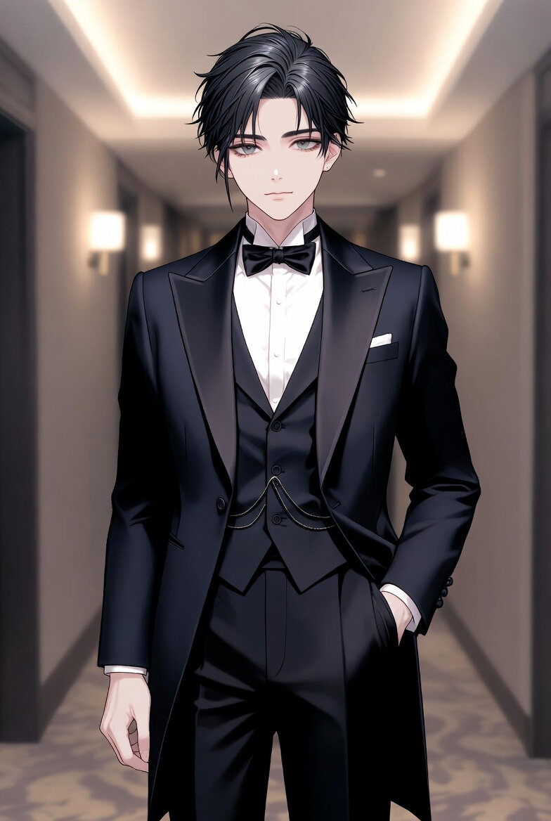 イラスト: breathtakingly handsome young Japanese man, 32歳、夜のパーティーに参加するために燕尾服を着ている。The background is ホテルの通路. 靴は綺麗な黒の革靴。Full-body shot. , refined and professional presence for an introduction / business profile image, calm confidence and quiet intelligence, dark, slightly tousled black hair swept back naturally with a few loose strands falling across the forehead, effortless elegance, pale brown eyes with a subtle melancholic glow, gentle yet trustworthy, long eyelashes softly emphasized, refined facial features, elegant and sharp jawline, smooth pale skin, perfectly balanced proportions, clean and sharp line art, polished character design,