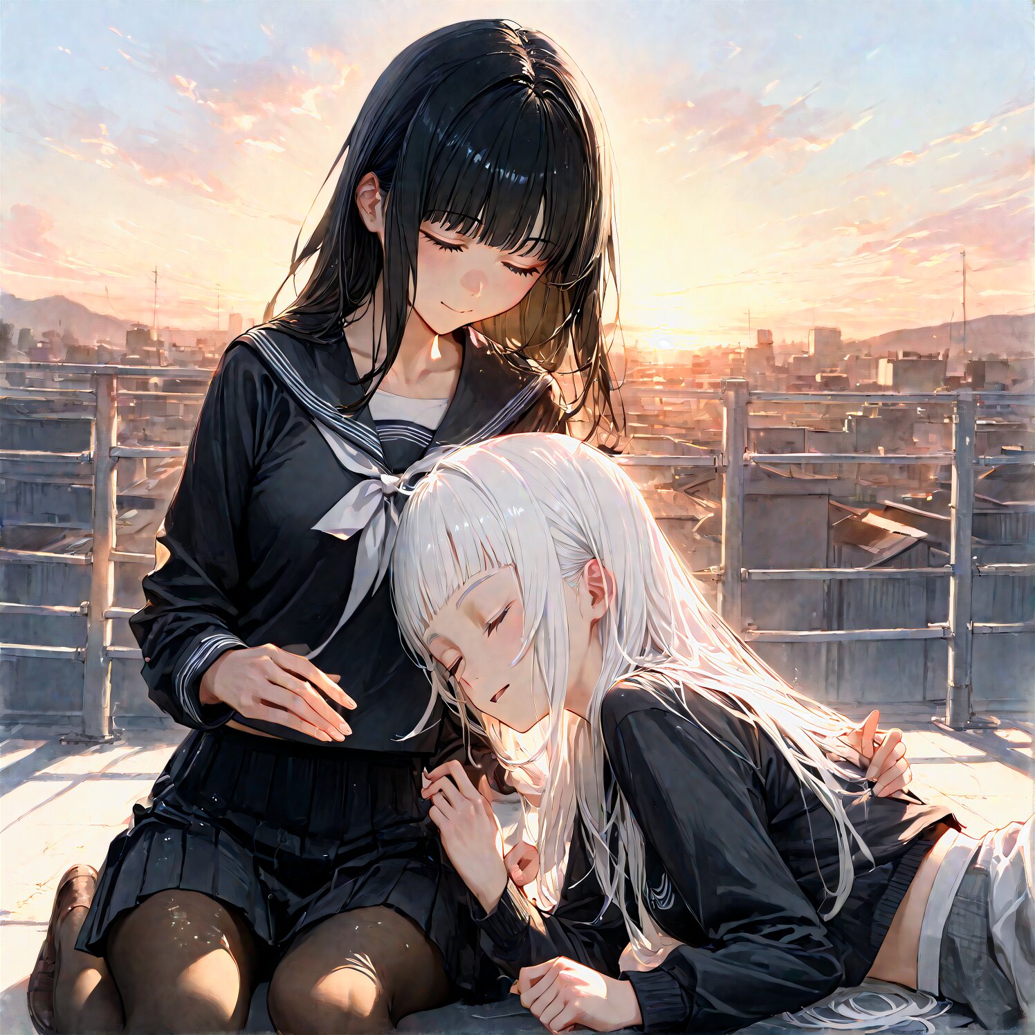 ((extremely detailed CG,ultra-detailed, high resolution,best quality, perfect anatomy:1.5,)) (clothes reflecting light,caustics,deep shadows,faint light,) 2girls, pantyhose, bangs, long sleeves, sidelocks, white hair, black hair, collarbone, yuri, mole, mole under eye, sunset, back lighting, sketch, ink painting, traditional media, <lora:legs_detailed_2.0:0.66> detailed_legs, legs, <lora:DetailedPerfect_hands_r1:0.63>detailed hands, perfect hands, fingernails, realistic, semi-realistic hands, gradient,palms,outstretched hand, fingers, <lora:shuicai:0.65> watercolor (medium), <lora:school_rooftop_v0.1:0.66> school rooftop, outdoors, sky, fence, <lora:BserafukuV1:0.6> black serafuku, bangs, long sleeves, midriff peek, sidelocks, white hair, black hair, collarbone <lora:LapPillowNonPOV_pdxl_Incrs_v1:1.66> lap pillow, lying, on side, sitting, long hair, blush, smile, 2girls, closed eyes, long sleeves, open mouth, sleeping, closed mouth, yuri, head on thighs,