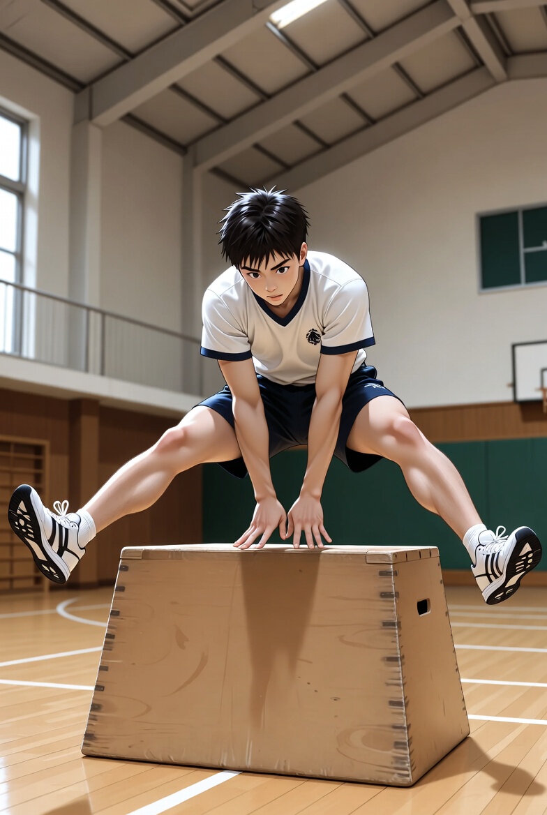 An illustration of a Japanese male high school student clearing a vaulting box in a gymnasium during physical education class.服装は高校の体操着と体育館シューズ。跳躍スタイルは、前方開脚跳び、踏み切った後、両手で跳び箱の天面に掌をつけ、両足を開脚して通過する。