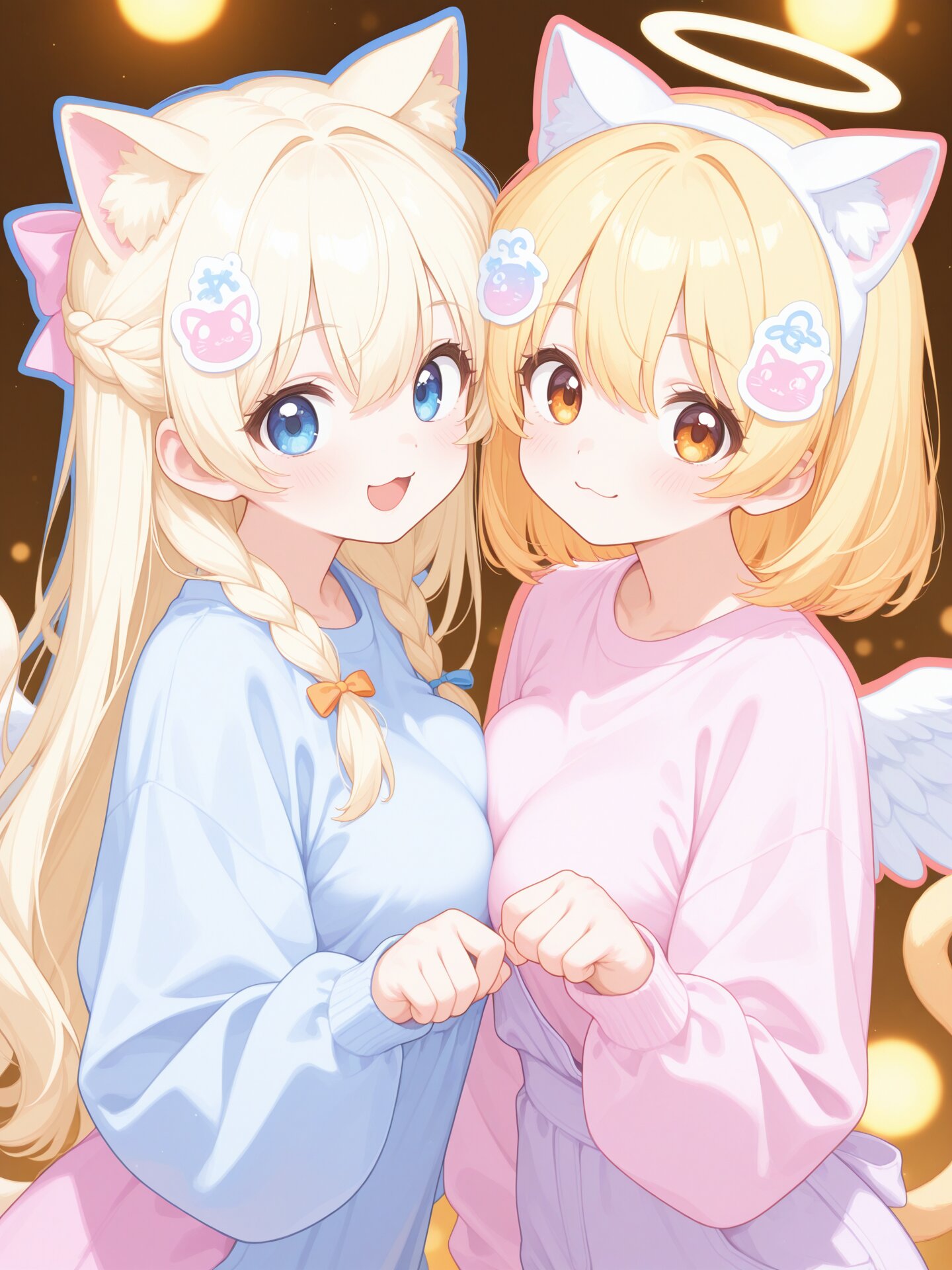 masterpiece, best_quality, high_quality, high_resolution, anime illustration, anime artstyle, art detailed, ((bright colors:0.8)), ((face detailed:1.5)), ((eyes detailed:1.5)), big eyes, cute eyes, ((hair detailed:1.5)), ((clothes detailed:1.5)), ((outfit detailed:1.5)), ((art quality:1.5)), ((view fixed:1.5)), soft pastel color palette, pastel style, soft colors, pastel colors, kawaii style, cute aesthetic, yamikawa style, colored lineart, colored outline, retro pastel touch, sticker style, clean illustration, clear image, smooth shading, art decorations, BREAK 2girls, clean and lively atmosphere, looking at viewer, smiling faces, symmetrical docking, side by side, together, interacting, blush, friendly vibe, upper body, paw pose, BREAK (girl A:1.15), left side, blue eyes, long blonde hair, hair between eyes, braid, natural small cat ears, natural cat tail, medium breasts, ribbon, big smile, :3, open mouth, +++, BREAK (girl B:1.15), right side, amber eyes, blonde hair, medium bob hair, tareme, blush, fake animal ears, white cat ears, white hairband, soft smile, halo, angel wings, large breasts, BREAK distinct faces, different hairstyles, balanced composition, (Atmosphere & Lighting) warm ambient light, soft glow, clean and polished illustration, high visual clarity, strong artistic presence, overall impression of beauty, craftsmanship, and visual impact