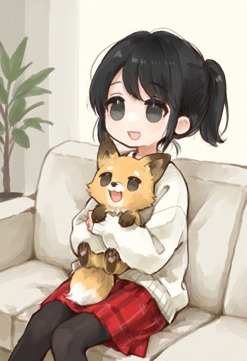 <lora:inmnstyleilxl:0.9>, living room, sitting sofa, upper body, chibi, solo, 1girl, (young girl), cute face and eyes, big breasts, black hair, clear black eyes, single short ponytail hair, cute and lovely, Vigorous, lively, and spontaneous personality, white sweater, hugging fox, red plaid flare skirt, black tights, ultra-detailed, best quality, masterpiece, very aesthetic, watercolor painting, general, smile, open mouth