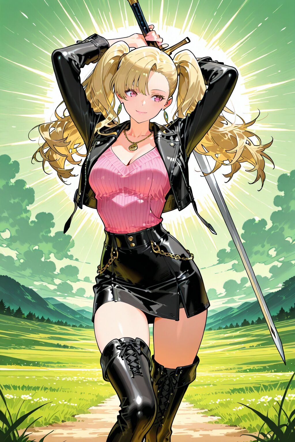 Blonde girl, asymmetrical bangs, long hair as beautiful as silk, twin tails, pink eyes, large bust, pink knit top, leather cropped jacket, gold necklace, leather miniskirt, leather thigh-high boots, holding a long sword, smiling, tilting her head, earrings, pink lips, background of a grassland during an adventure