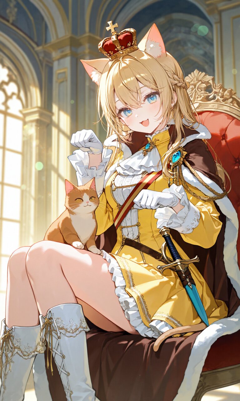 A stunning 18-year-old girl with a cute, delicate face and beautiful blue eyes sits gracefully on a (luxurious chair:1.5) in a grand palace. She has long blonde hair styled in an intricate braid, with blonde cat ears peeking through and strands of hair falling between her eyes. She wears a (Pale Yellow luxurious prince costume:1.4) with a (Brown luxurious cape:1.2) draped elegantly over her shoulders. Her outfit includes a (luxurious mini skirt with white frills:1.4), long sleeves, a white lace jabot, and (luxurious White gloves:1.2). A (dagger on waist:1.3) and a (luxurious crown on head:1.2) complete her royal look, while she wears (White luxurious Boots:1.3). She strikes a playful "paw pose" with her knees together and feet apart, holding (a cute kitten:1.5) in her lap. Her cheerful smile and :3 expression radiate happiness. The background features renaissance architecture with soft afternoon sunlight streaming through tall windows, creating a bloom effect and lens flares that enhance the romantic, blissful atmosphere. The illustration style is highly detailed, with intricate textures in the fabrics, architecture, and lighting, evoking a chill yet luxurious mood.