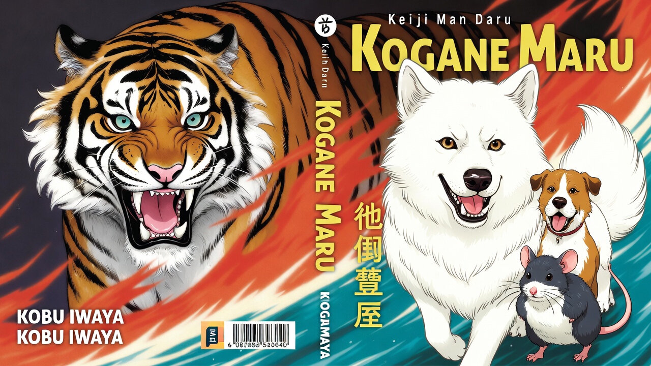 以下は、巖谷小波の作品「こがね丸」のあらすじです。このあらすじにフィットする本の表紙を制作してください。 物語は、主人公の白犬・こがね丸の両親が、強大な虎の金眸大王(きんぼうだいおう)に殺される悲劇から始まります。父犬の月丸は金眸に食い殺され、母犬の花瀬もそのショックで亡くなります。孤児となった幼いこがね丸は、母の遺言により、荘官の家に住む牛の夫婦(文角と牡丹)に養育を託されます。彼らはこがね丸を立派に育て上げ、仇討ちの旅に出る準備を整えます。 成長したこがね丸は、親の仇である金眸を討つ決意を固め、旅に出ます。道中で出会う仲間たちと協力しながら冒険を繰り広げます。主要な仲間には、猟犬の鷲郎(わしろう)や鼠の阿武松(あぶまつ)などがおり、義兄弟の契りを結んだ鷲郎とは特に強い絆で結ばれています。物語は、こがね丸たちがさまざまな試練を乗り越え、雉子(きじ)の所有権を巡る争いや、言葉遊びを交えたユーモラスなエピソードを挟みながら、金眸大王との対決に向かいます。起伏に富んだストーリーと動物の敵討ちという滑稽さが魅力で、最終的に仲間たちの助力を得て仇を討ち、物語はハッピーエンドで締めくくられます。 この作品は、文語体で書かれているため、当時の子どもたちにも読みやすく工夫されており、明治期のベストセラー児童文学として位置づけられています。全体を通じて、勇気、忠義、友情のテーマが強調され、小波の「お伽噺」スタイルの基礎を築いた一冊です。