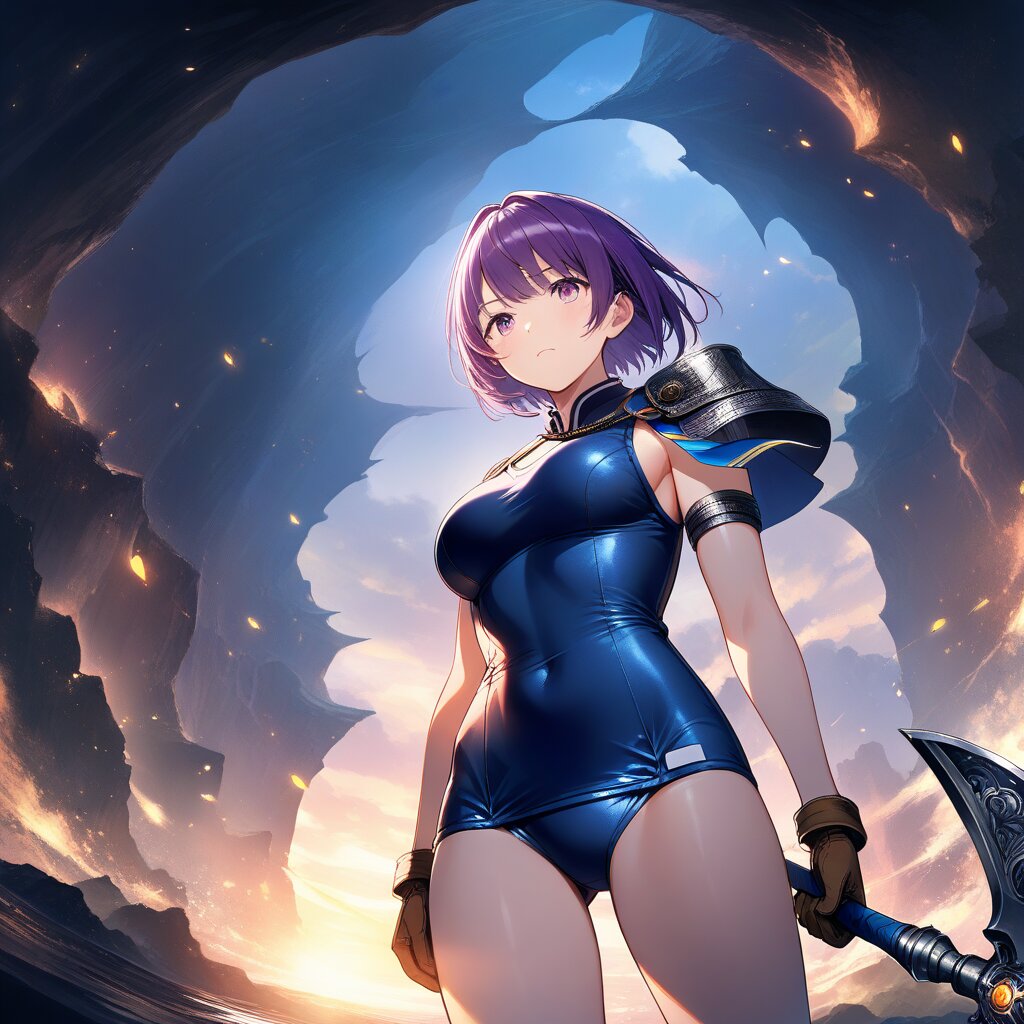 ((masterpiece)), ((best quality)), (ultra-detailed), illustration,cowboy shot, Deep cave, at dusk,large bust,(school swimsuit), navy blue, short hair, purple hair, Holding a weapon in hand, gripping Battle Axe