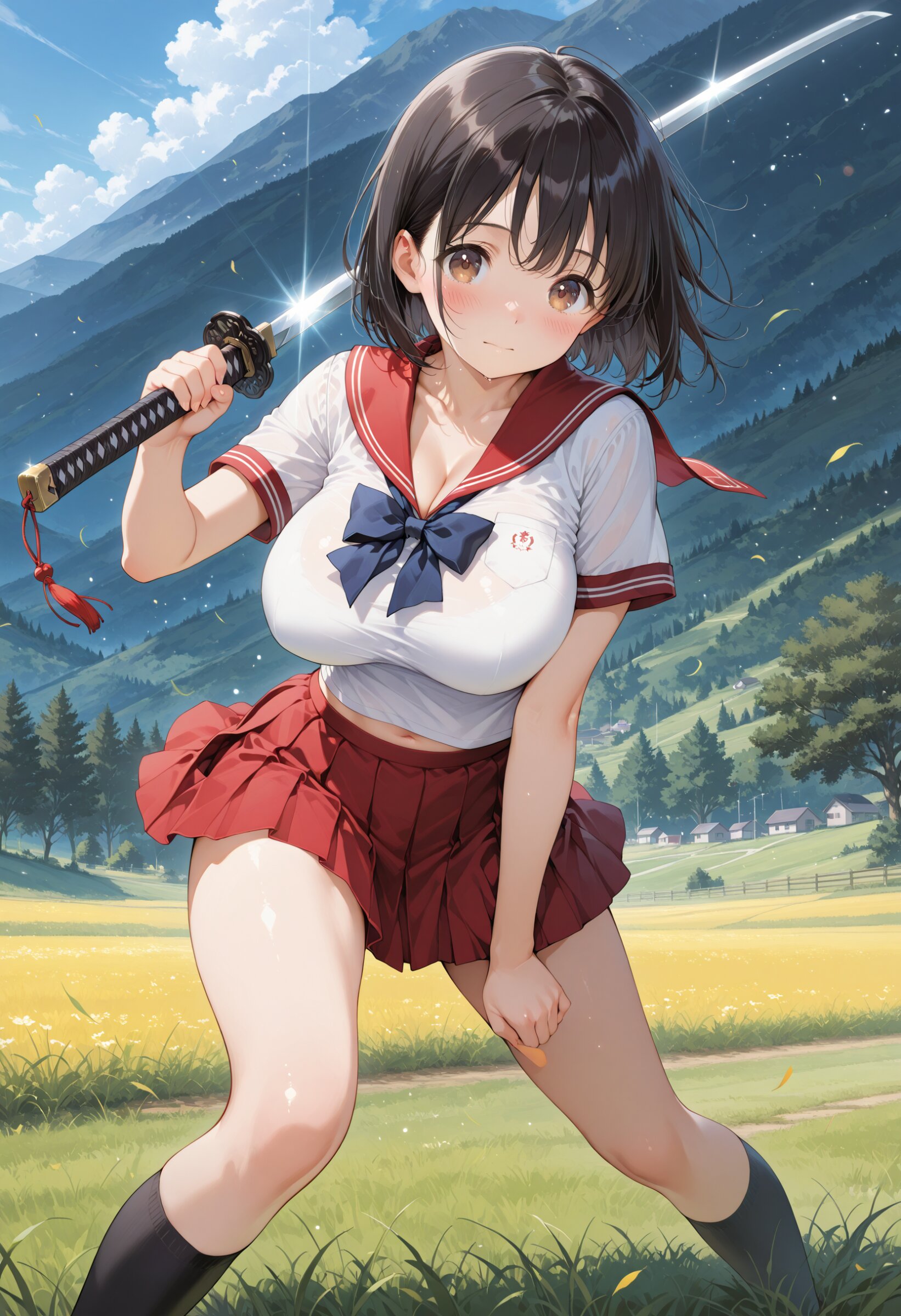 masterpiece, best quality, amazing quality, general, fine detail, official art, 1girl, loli, school sailor uniform, red sailor collar, white sailor shirt, short sleeves, red miniskirt, , cleavage between sailor collar, midriff peek, black thigh-high socks, beautiful black hair, beautiful brown eyes, beautiful legs, big breasts, impossible clothes, perky breasts, grassland road, innocent expression, Swinging a sword, dynamic pose, blush,