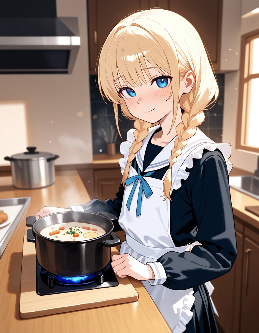 masterpiece, best quality, newest, absurdres, highres, detailed eyes, beautiful detailed face, perfect anatomy, 1girl, solo, trap, otoko no ko, flat chest, petite, long hair, twin braids, blonde hair, blue eyes, gentle smile, soft blush, looking at viewer, winter school uniform, black serafuku, sailor collar, long sleeves, blue neck ribbon, white kappogi, white kitchen apron, frilled apron, waist apron, indoors, restaurant kitchen, wooden counter, cutting board, vegetables, pot, steaming pot, steam rising, warm indoor lighting, cozy winter atmosphere, soft shadows, depth of field, bokeh