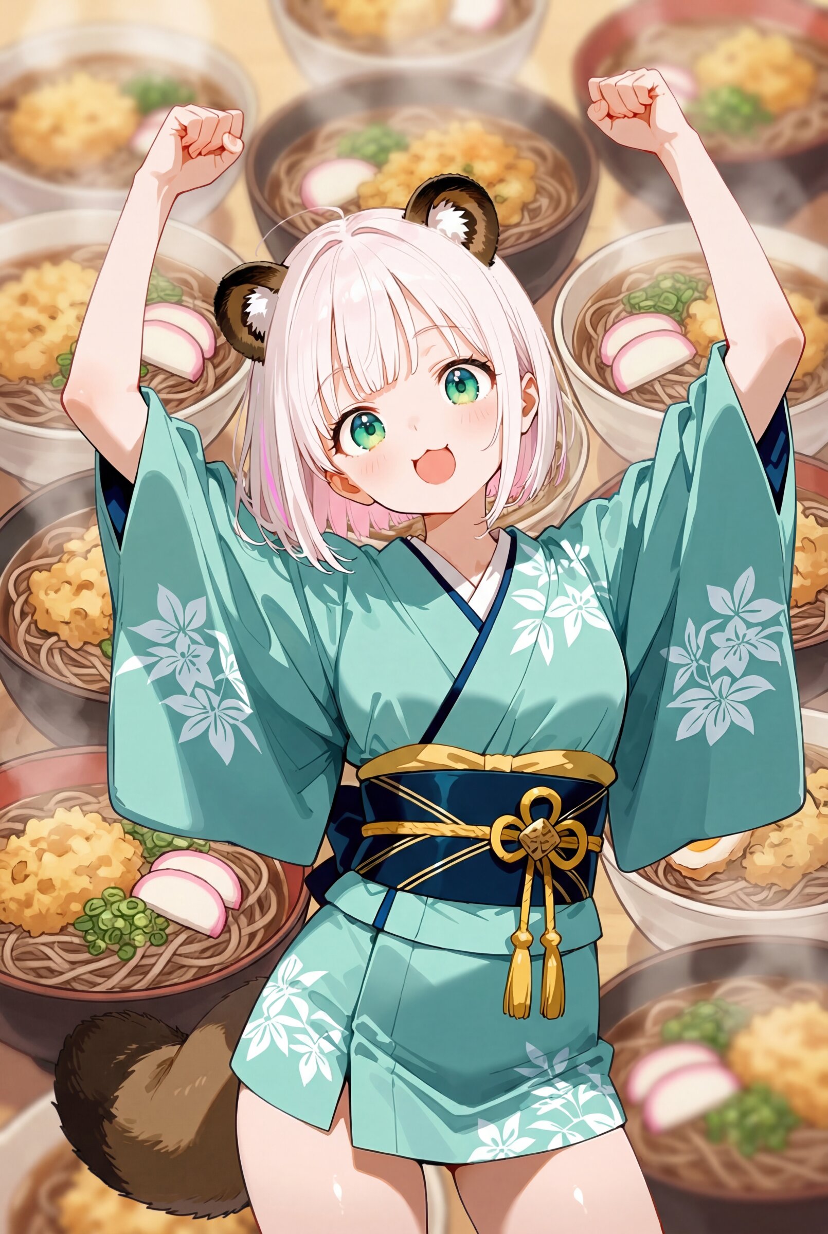 たくさんのたぬきそばに囲まれて小躍りしているみどりが可愛い😍