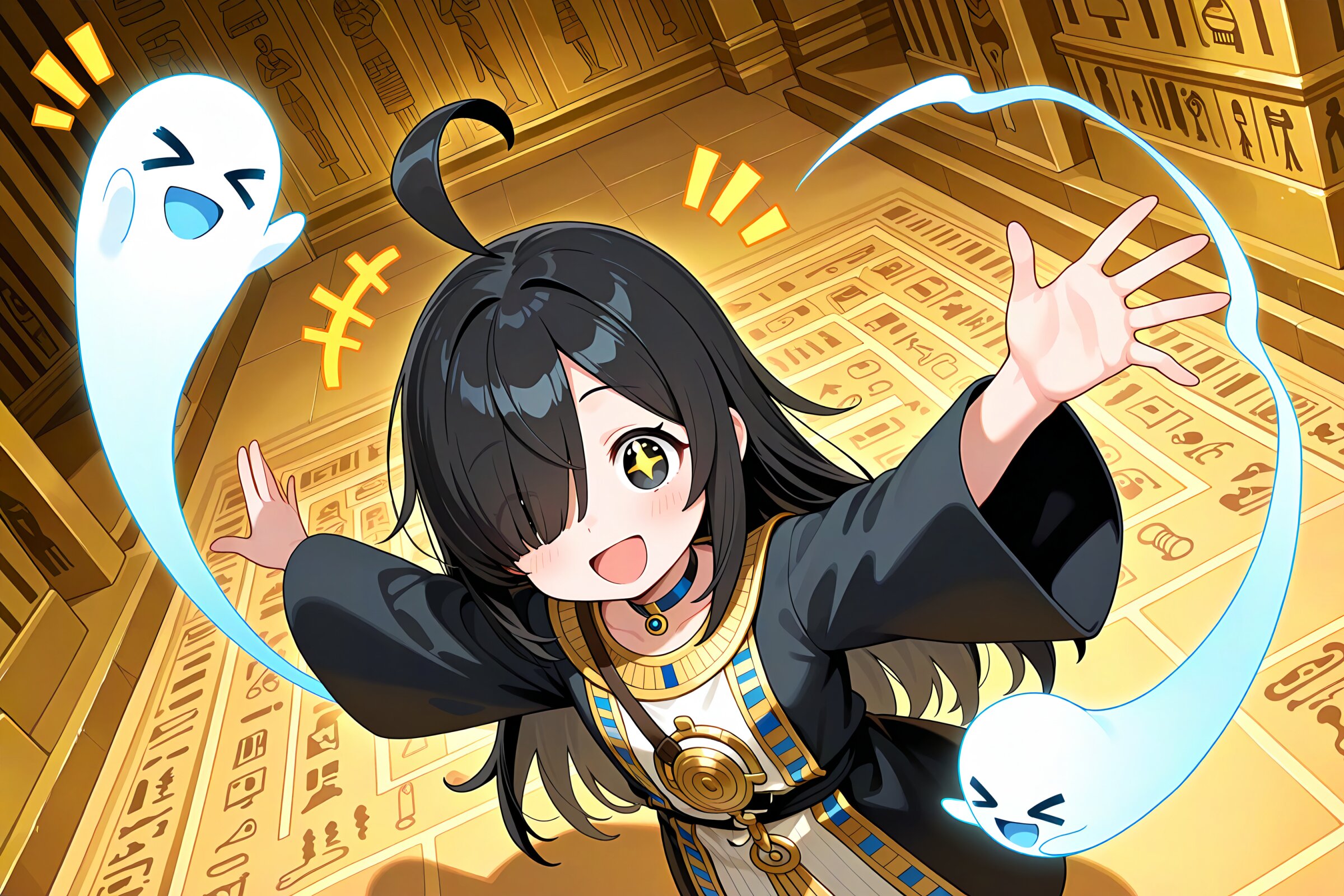 1 little girl, solo, diagonal angle, masterpiece, best quality, amazing quality, very aesthetic, black hair, long hair, ahoge, (hair over one eye:1.2), black eyes, +_+, open mouth, smile, cheerful, +++, notice lines, choker, traveler \(journey\) outfit, ghost, > <, Hieroglyphs, in ancient egyptian museum,