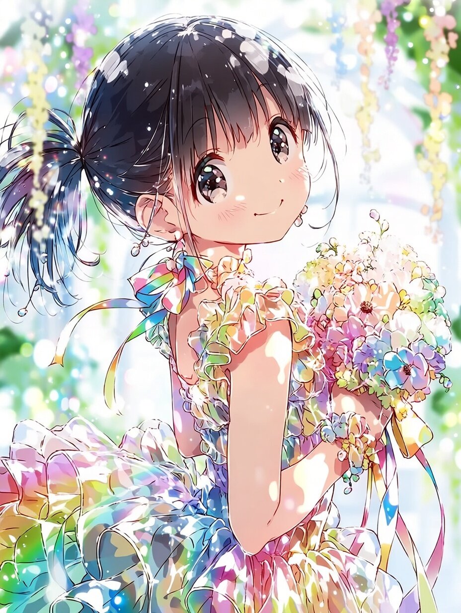 (masterpiece, best quality, highres, 8k wallpaper:1.2), extremely detailed, (ultra-detailed eyes, sparkling eyes:1.1), (soft lustrous skin), 1girl, young girl, cute and charming presence, adorable face with soft round features, cute expressive eyes, clear black eyes with lively sparkle, black hair styled in a single short ponytail, neat yet playful, slightly bouncing with movement, fresh and youthful impression, cute, lovely, vigorous, lively, and spontaneous personality expressed through her smile and posture, wearing a colorful formal dress, elegant yet youthful design, soft flowing fabric, pastel or jewel tones, gentle frills and ribbons adding sweetness without excess, beautifully balanced silhouette, holding a bouquet of flowers in both hands, fresh blossoms in soft pinks, whites, or seasonal colors, symbolizing joy and celebration, (cinematic lighting), (soft focus), bright and gentle lighting that flatters the skin and enhances a cheerful mood, tyndall effect, bloom, subtle rim lighting outlining hair and dress, (glowing light:0.8), dynamic yet graceful pose, slight turn of the body, depth of field, rule of thirds, looking toward the viewer with a bright and innocent smile, elegant ceremony or garden-like background, soft greenery, light decorations, sunlit atmosphere, gently blurred background with bokeh, transparent and airy feeling, wholesome and joyful mood, non-sexual, pure and celebratory illustration, high-quality anime-style digital artwork suitable for formal or commemorative visuals