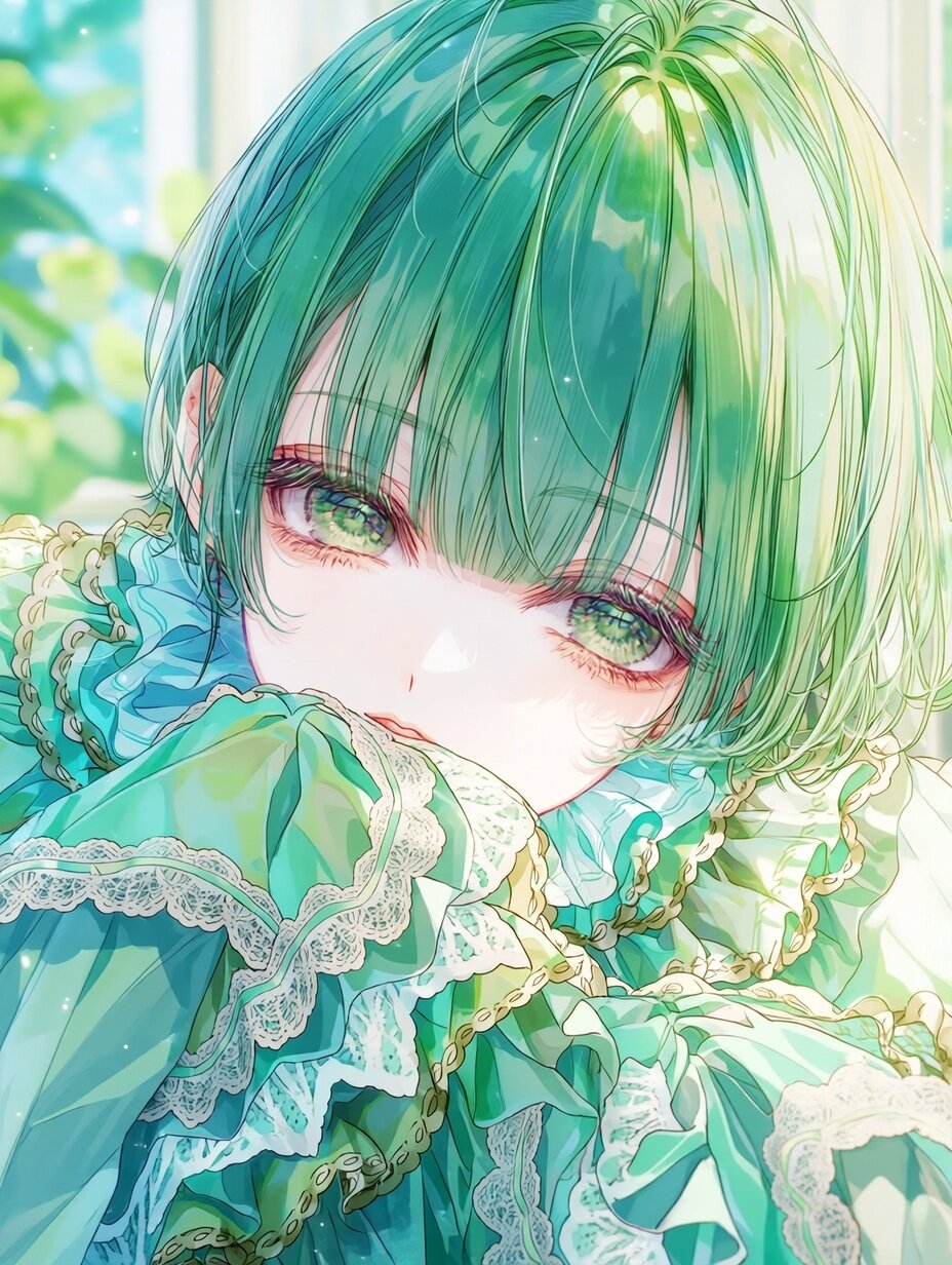 (masterpiece, best quality, highres, 16k wallpaper:1.2), insanely detailed, extremely detailed, beautiful, (ultra-detailed eyes, sparkling eyes, catchlight in eyes:1.1), (soft lustrous skin), 1boy (otokonoko), androgynous bishounen beauty, delicate and gentle presence, refined and soft impression, green hair, beautifully detailed and glossy, short straight hair with blunt bangs, subtle hime cut, a single cute ahoge adding charm, fine and delicate hair strands carefully rendered, dark green eyes, large and expressive with a clear sparkle, calm and slightly shy gaze, long eyelashes, defined and beautifully detailed face, soft jawline, smooth pale skin, perfectly balanced proportions, wearing a beautiful green-colored dress, elegant and graceful design, emerald and mint green tones, soft gradients, flowing fabric, gentle frills and ribbons used tastefully, dress designed to enhance cuteness and elegance rather than maturity, feminine yet pure silhouette, lace and satin textures subtly shimmering, (cinematic lighting), (soft focus), gentle pastel lighting that enhances the green color palette and skin clarity, tyndall effect, bloom, soft rim lighting highlighting hair contours and dress edges, (glowing light:0.8), composed and slightly shy pose, hands gently gathered or lightly holding the skirt, depth of field, rule of thirds, looking softly toward the viewer, elegant fantasy or softly lit indoor background, green and ivory tones harmonizing with the dress, floating light particles, gentle bokeh, transparent and airy atmosphere, pure and cute mood, refined otokonoko aesthetic, high-end anime-style digital illustration, delicate, charming, and emotionally gentle composition