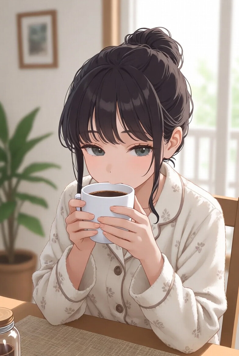 日本人女性24歳のイラスト。朝にダイニングで入れ立てのコーヒーを飲んでいるシーン。服装は冬のパジャマ。