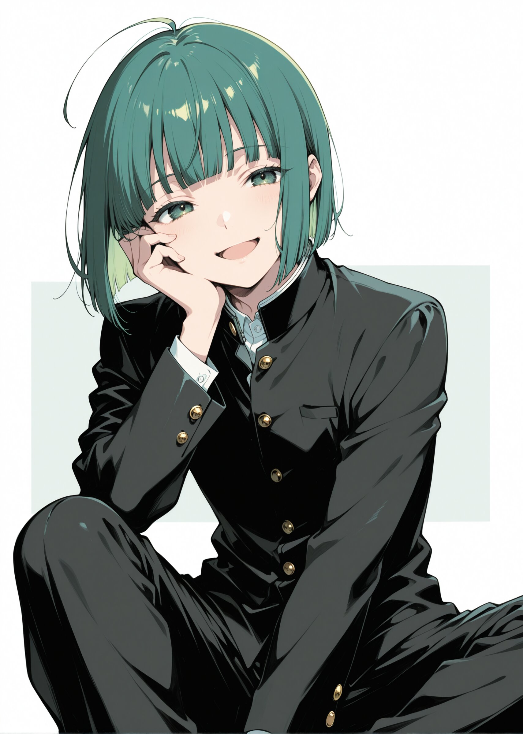 Best quality, Masterpieces, simple background, negative space, anime-style illustration, white background, fine detail, 1boy, otoko no ko, green hair,dark green eyes,blunt bangs,ahoge,short hair,straight hair,hime cut,delicate face,delicate hair,beautifully detailed hair,defined detailed face,beautiful detailed eyes,beautiful detailed eyes,catchlight in eyes, Sitting with one hand on the cheek, smile, open mouth, black, crisp, starched, high-necked, put on one's best clothes, ((gakuran:1.2)), button-down, black long pants, two-tone background, soft pastel colors, minimalistic, solid color, no texture, solo,