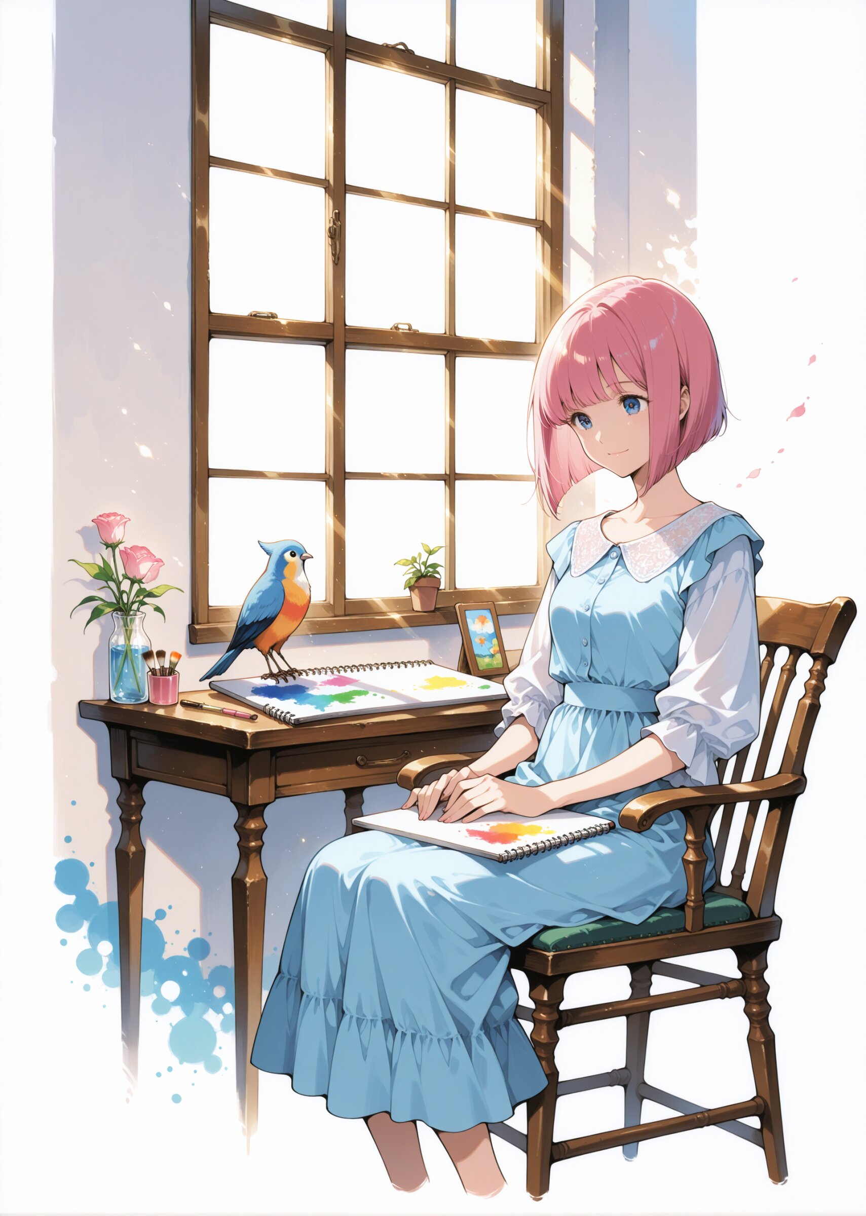 Best quality, Masterpieces, simple background, negative space, anime-style illustration, white background, fine detail, 1girl, Pink bob cut with outward-flipped ends, large eyes, light smile, Contemporary dresses inspired by traditional French fashion, featuring elegant silhouettes with modern fabrics and sleek designs, content, artistic composition, scattered paint tubes and brushes, sunlight streaming through large window, lovebird perched on a sketchbook, cozy and creative space, sitting, chair, character focus,