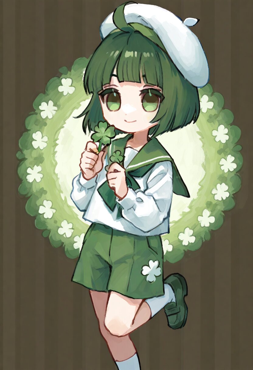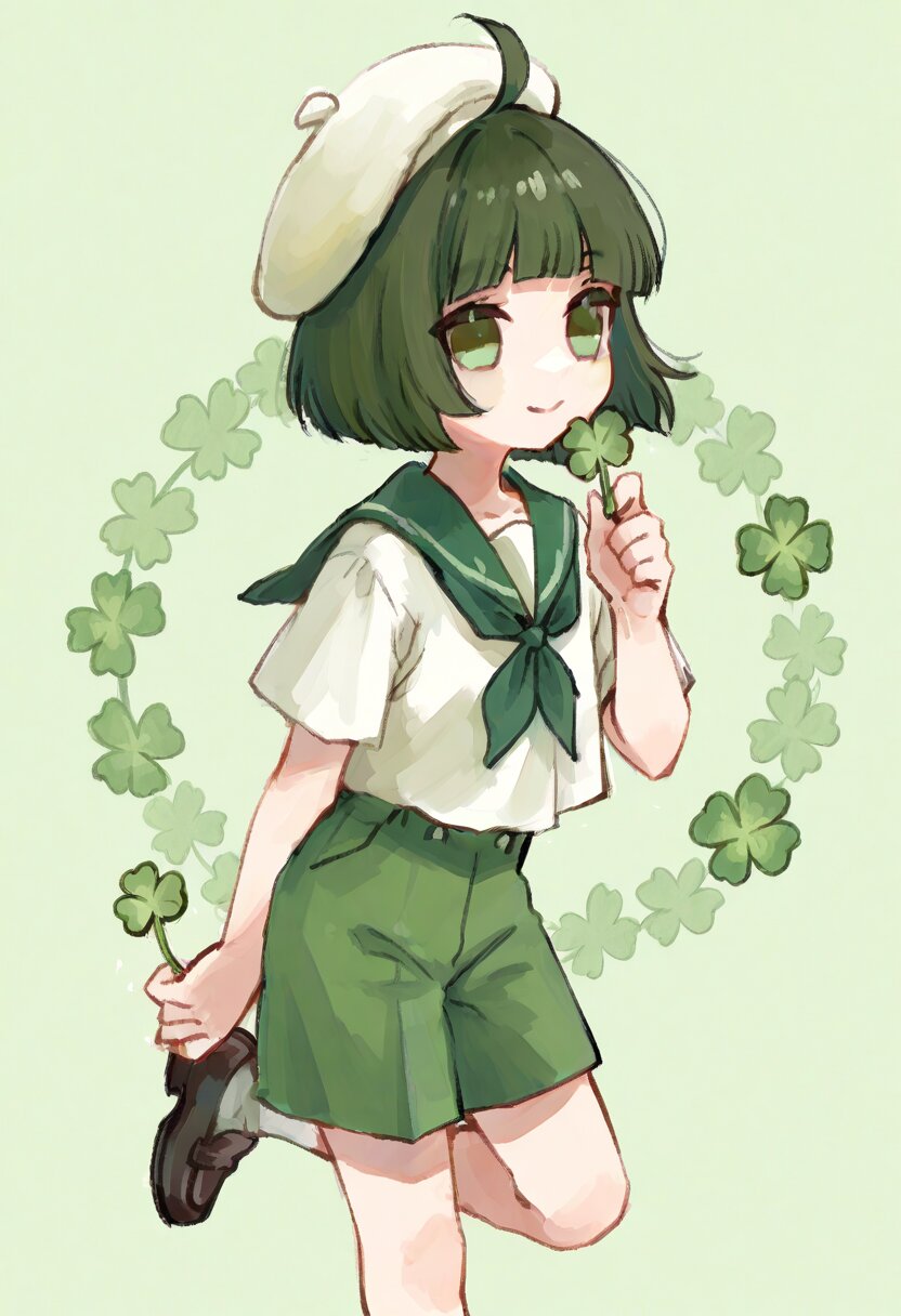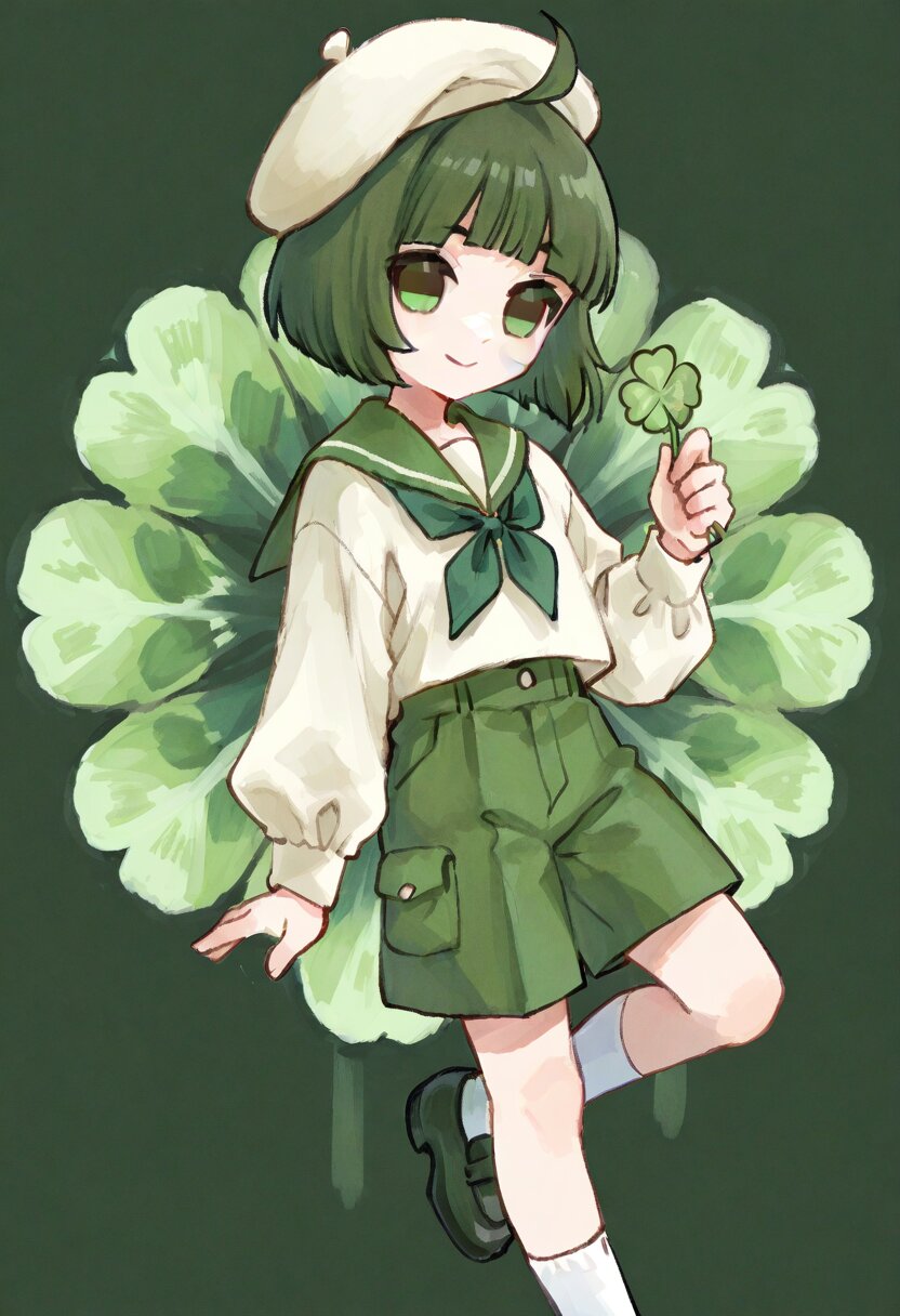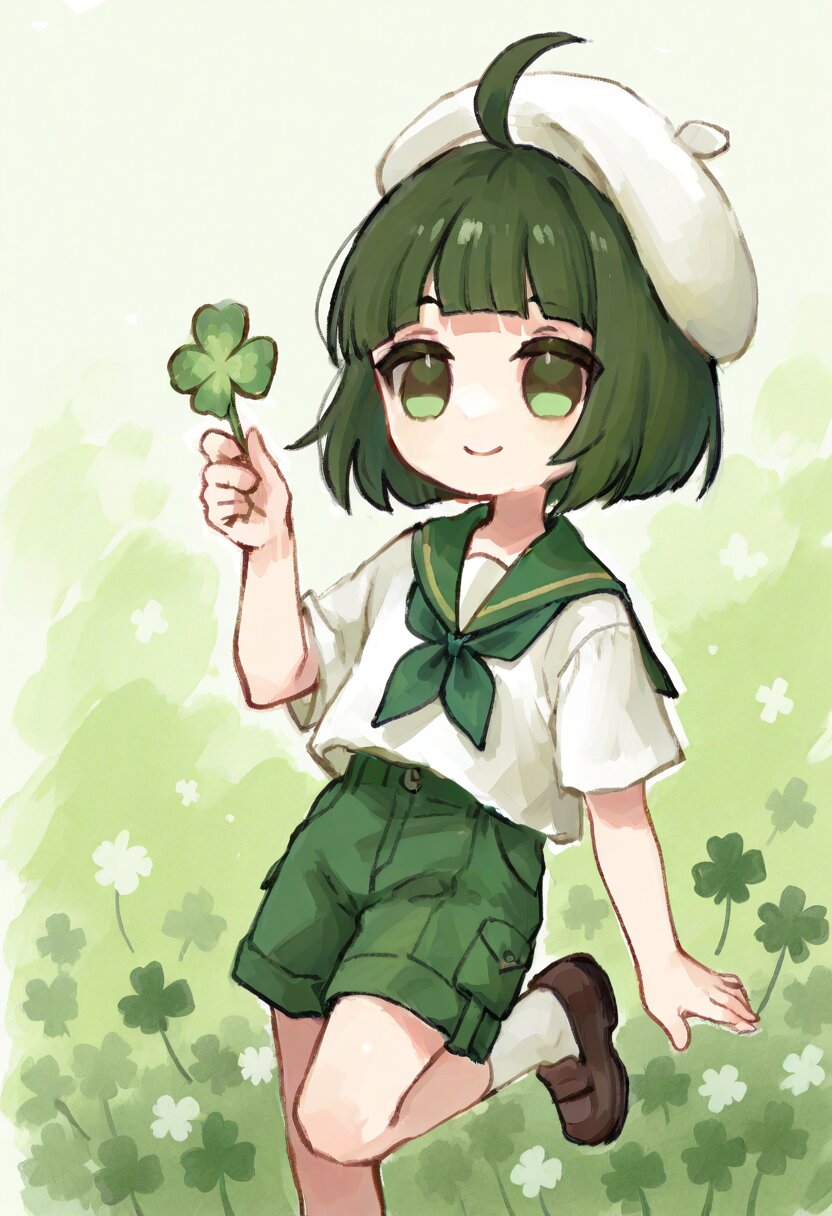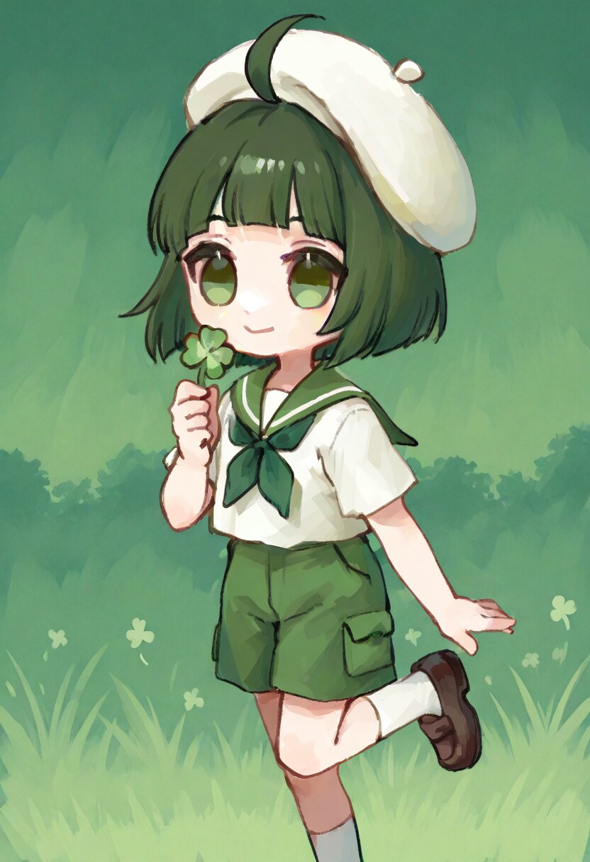 <lora:inmnstyleilxl:0.9>, 1boy, green hair, dark green eyes, blunt bangs, ahoge,s hort hair, straight hair, bob cut, blunt hair, holding clover, green sailor collar, white tops, green shorts, white socks, white beret, leg up, smile, chibi, solo, ultra-detailed, best quality, masterpiece, very aesthetic, watercolor painting, general