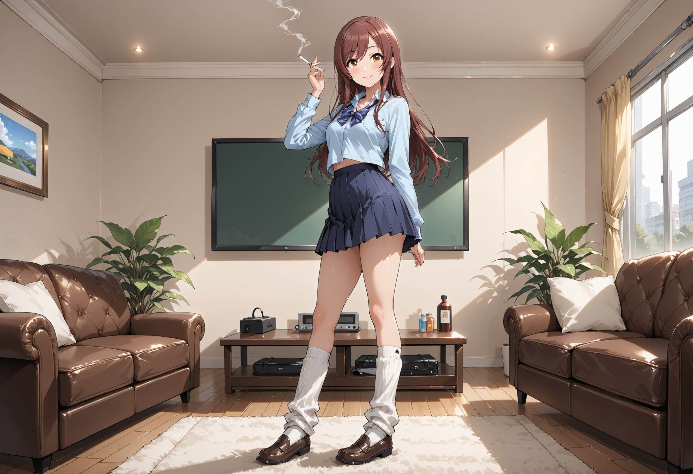 High resolution, Super detailed, Best Quality, masterpiece, 8K, 4K, beautiful background, the best aesthetics, BREAK 1 girl, Osaki amana, The Idolmaster Cinderella Girls,school uniform, loose white socks,,full body,smile, standing wear loafers, smoking tabaco, BREAK living room, surrender many garbage,
