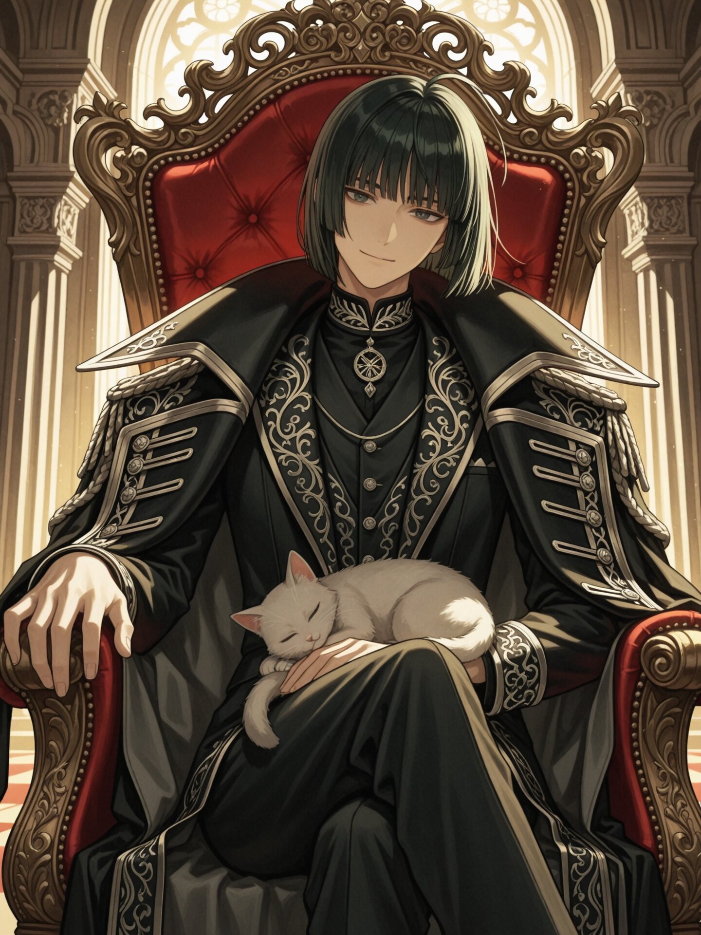 1boy,green hair,dark green eyes,blunt bangs,ahoge,short hair,straight hair,hime cut,delicate face,delicate hair,beautifully detailed hair,defined detailed face,beautiful detailed eyes,beautiful detailed eyes,catchlight in eyes,masterpiece,best quality,insanely detailed,beautiful, young prince, dignified and arrogant expression, calm confident smile, slightly disdainful gaze, relaxed yet dominant posture, sitting on an ornate royal throne, one arm resting on the armrest, legs relaxed and slightly apart, small cat sleeping peacefully on his lap, soft fluffy fur, cat curled up comfortably, gentle breathing, calm and safe atmosphere, one hand lightly resting on the sleeping cat, subtle contrast between arrogant prince and gentle tenderness, luxurious prince outfit, royal coat with gold embroidery, deep emerald and black color scheme, high-quality fabric, refined details, grand throne room, soft dramatic lighting, subtle light rays, cinematic atmosphere, masterpiece, best quality, insanely detailed, beautiful, highly polished illustration