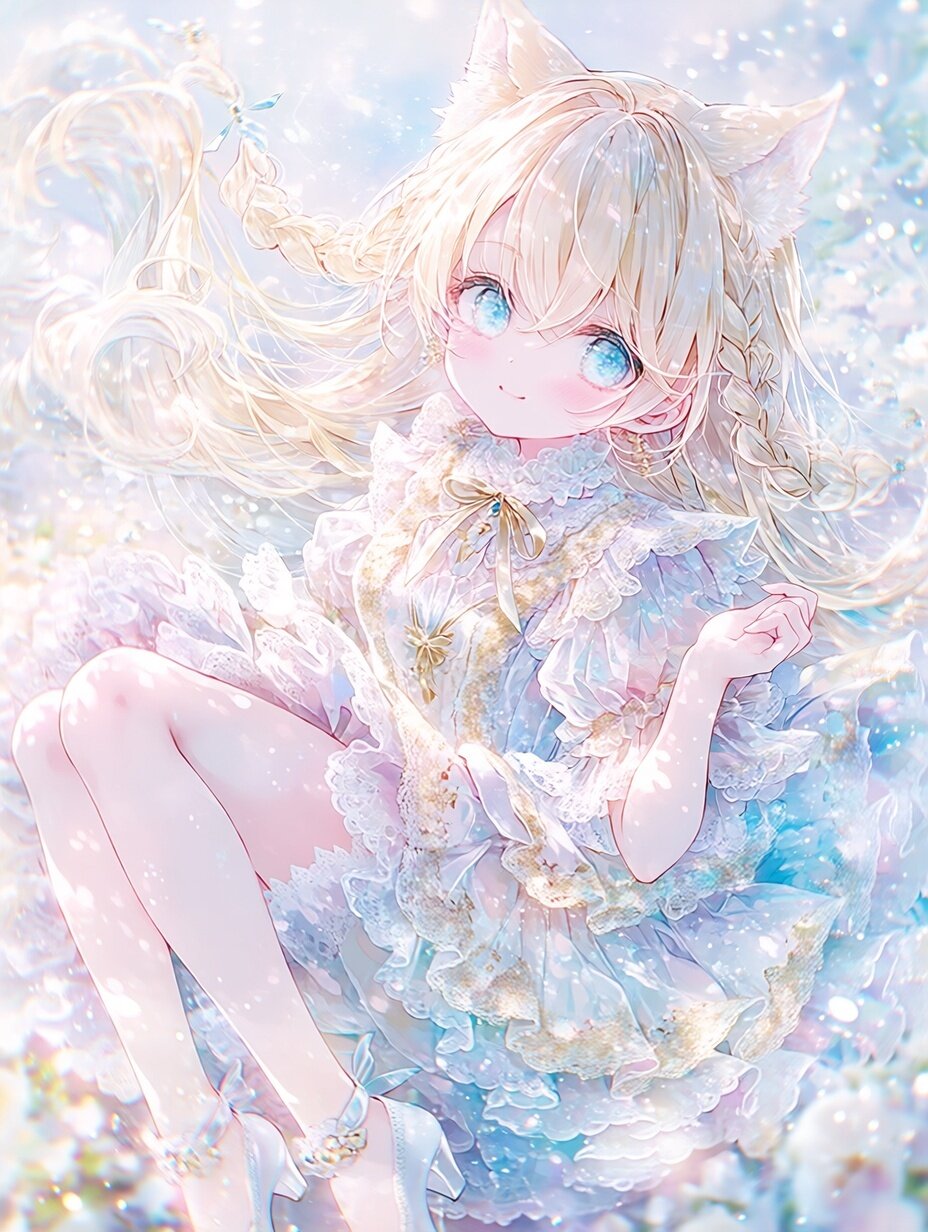 Full body, (Masterpiece, Highest Quality, High Resolution, 8K Wallpaper:1.2), Extremely detailed, Insanely detailed, (Super-detailed eyes, Sparkling eyes, Catchlight in eyes:1.1), (soft, lustrous skin), beautiful girl, lovely maiden, fantastical princess, ethereal and captivating presence, long blonde hair with a silky, glossy texture, flowing gently with soft volume, delicate braids woven into the hair, strands framing the face, hair falling between the eyes accentuating a dreamy, innocent expression, soft, fluffy blonde cat ears, harmonizing naturally with the hair, adding a magical, adorable charm, jewel-like, clear, sparkling blue eyes, rich with emotion and depth, expressive, a gentle smile, a faint blush, eyes filled with curiosity, kindness, and wonder, Long lashes emphasizing femininity, refined delicate features, smooth porcelain-like skin, clad in a fantastical princess dress, elegant and light design, layers of soft chiffon and lace, flowing silhouette, pastel and jewel tones (ivory, pale blue, soft gold), white heels, delicate magical motifs, ribbons and ornaments that do not detract from her purity, (cinematic lighting), (soft focus), soft magical light that beautifully illuminates the skin, gentle diffused light, Tyndall effect, bloom, hair or cat ears, rim lighting that elegantly highlights the dress's edges, (glow light: 0.8), elegant poses with a slight sense of movement, depth of field, rule of thirds, gazing at the viewer with a warm, picture-book-like gaze, fantastical backgrounds, floating particles of light, soft mist, glowing flowers, a magical palace or dreamlike garden, pastel sky hues, creamy bokeh, a transparent, airy atmosphere, a fairy-tale mood, pure fantasy elegance, emotionally rich and captivating, high-end commercial-quality fantasy illustration, dreamy and adorable, a dignified princess composition