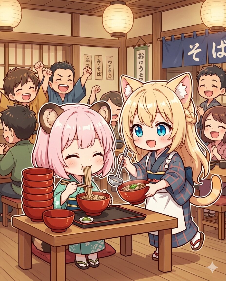 狸耳娘のみどりさんが、たぬきそばをわんこそばのように次々と平らげているユニークなシーン。 金髪猫耳娘のルルが給仕服で給仕をしており、次々と小さなお椀に入った蕎麦を足している。 伝統的な蕎麦屋さんでのイベントの雰囲気。 観客たちと共にみんな楽しそうにしている。 アスペクト比4:5で生成して。