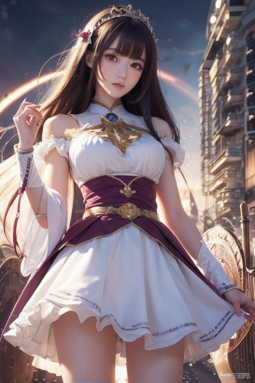 masterpiece, hyper detailed, 8K, hyper detailed illustration, Japanese woman, 23yo, cute, pretty, hyper detailed face, hyper detailed eye, beautiful eye, medium hair,bangs, thin, tall,170cm tall, magical girl costume short skirt, hyper detailed,