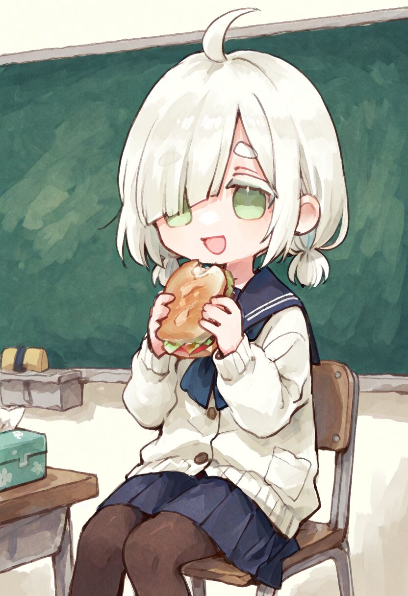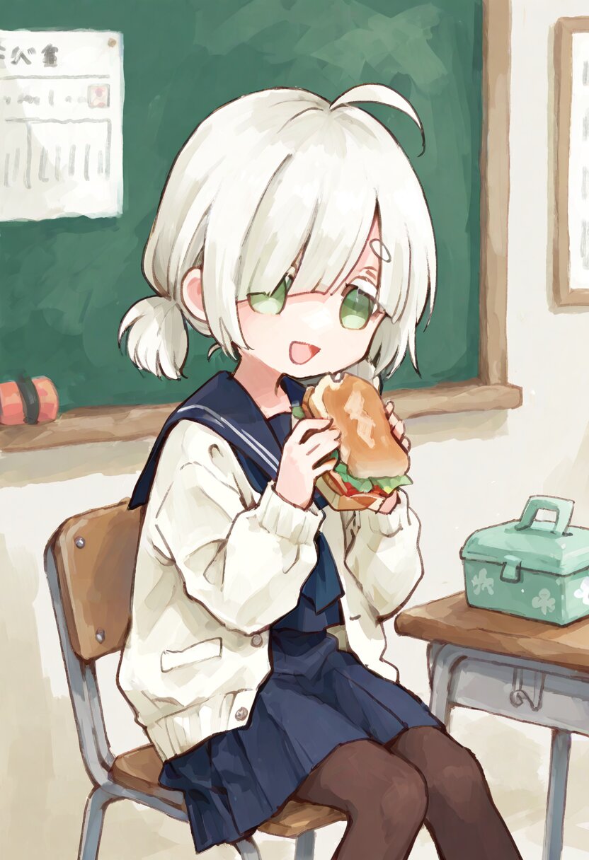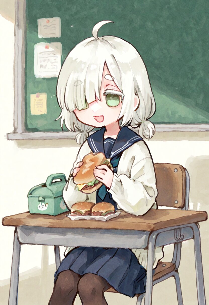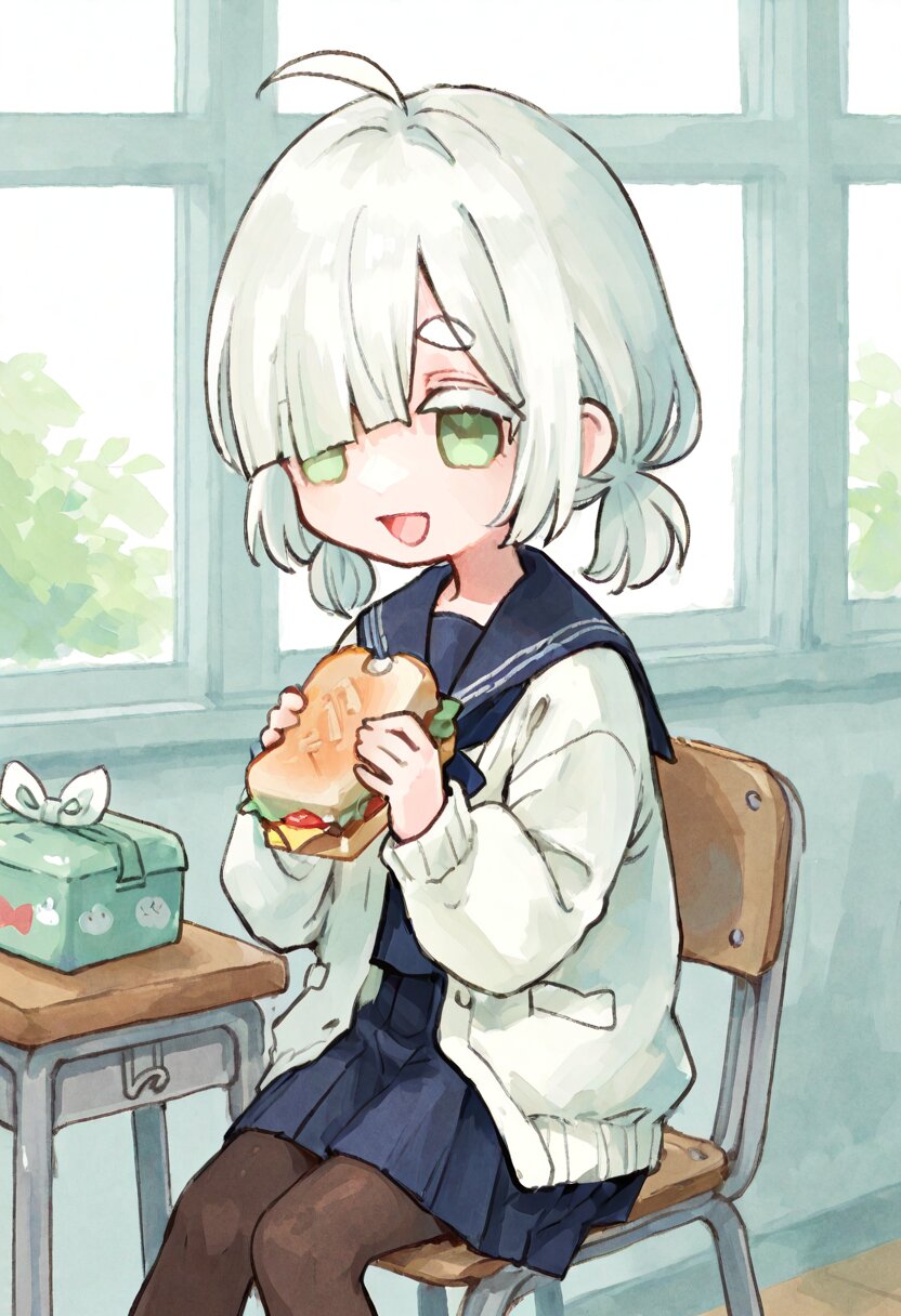 <lora:inmnstyleilxl:0.9>, classroom, holding sandwich, sitting chair, at desk, lunch box, navy sailor collar, chibi, white tops, navy pleats skirt, brown tights, solo, 1girl, (bright white hair), short hair, short low pigtails, blunt bangs, white thick eyebrow, white colored eyelashes, (hair over one eye), ahoge, mint green eyes, smile, open mouth, ultra-detailed, best quality, masterpiece, very aesthetic, watercolor painting, general