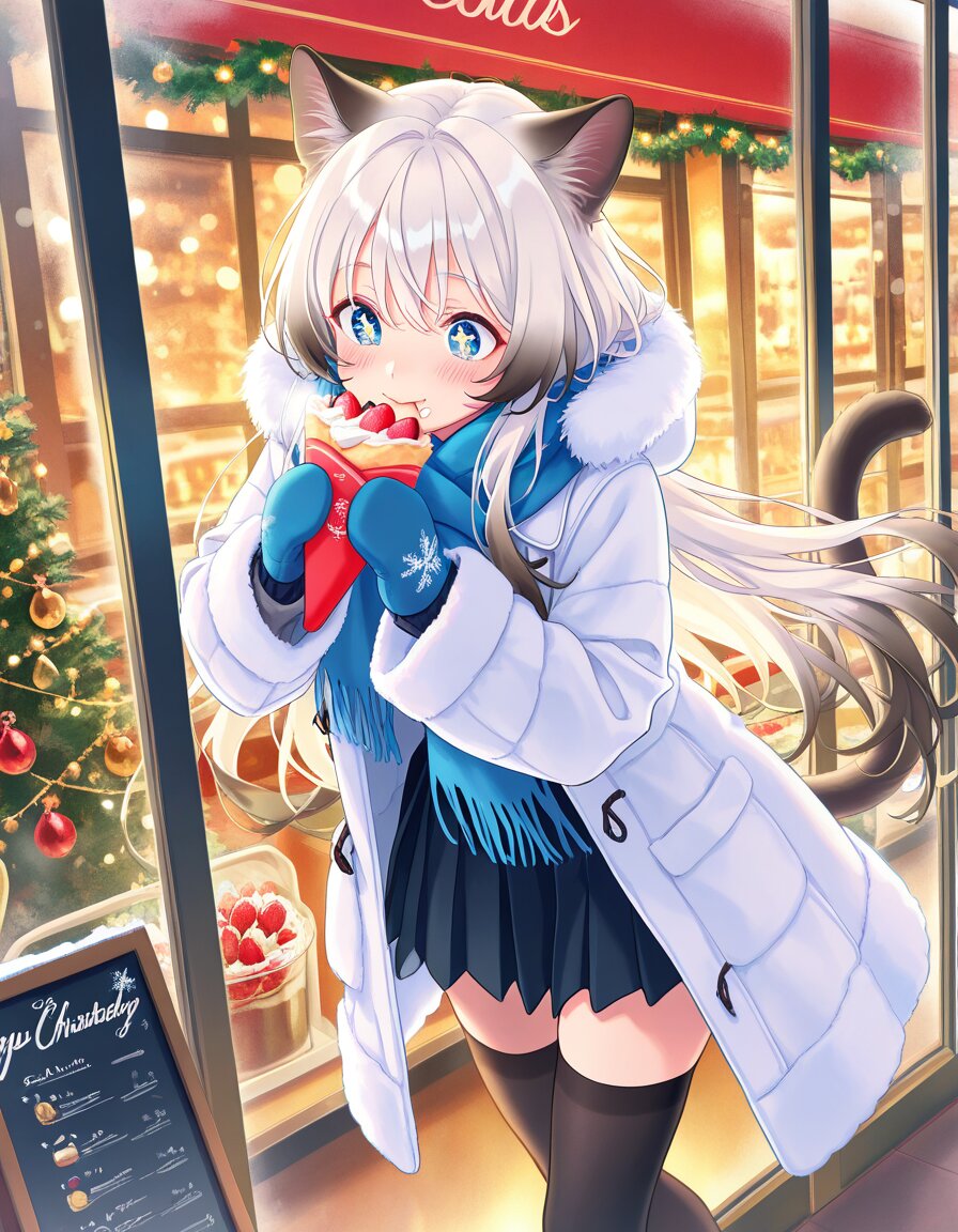 masterpiece, best quality, absurdres, very detailed background, winter street, snowy day, bustling shopping arcade, holiday season lights, warm shop windows, 1girl, solo, 18yo, siamese cat girl, cat ears, fluffy cat tail, white hair, black gradient hair, long hair, flowing hair, tareme, gentle eyes, [blue eyes:0.6], small breasts, cute fang, happy smiling, blushing cheeks, (kuragecut:1.4), wearing cute winter outfit, thick fluffy white coat with fur hood, short pleated skirt, black thighhighs, cute mittens, long scarf wrapped around neck, holding crepe with whipped cream and strawberries in one hand, taking bite, cream on lips, walking casually, looking at cute shop display window, sparkling eyes, relaxed happy atmosphere, soft bokeh, depth of field, warm color tones, christmas decorations, snowflakes floating, highly detailed, sharp focus