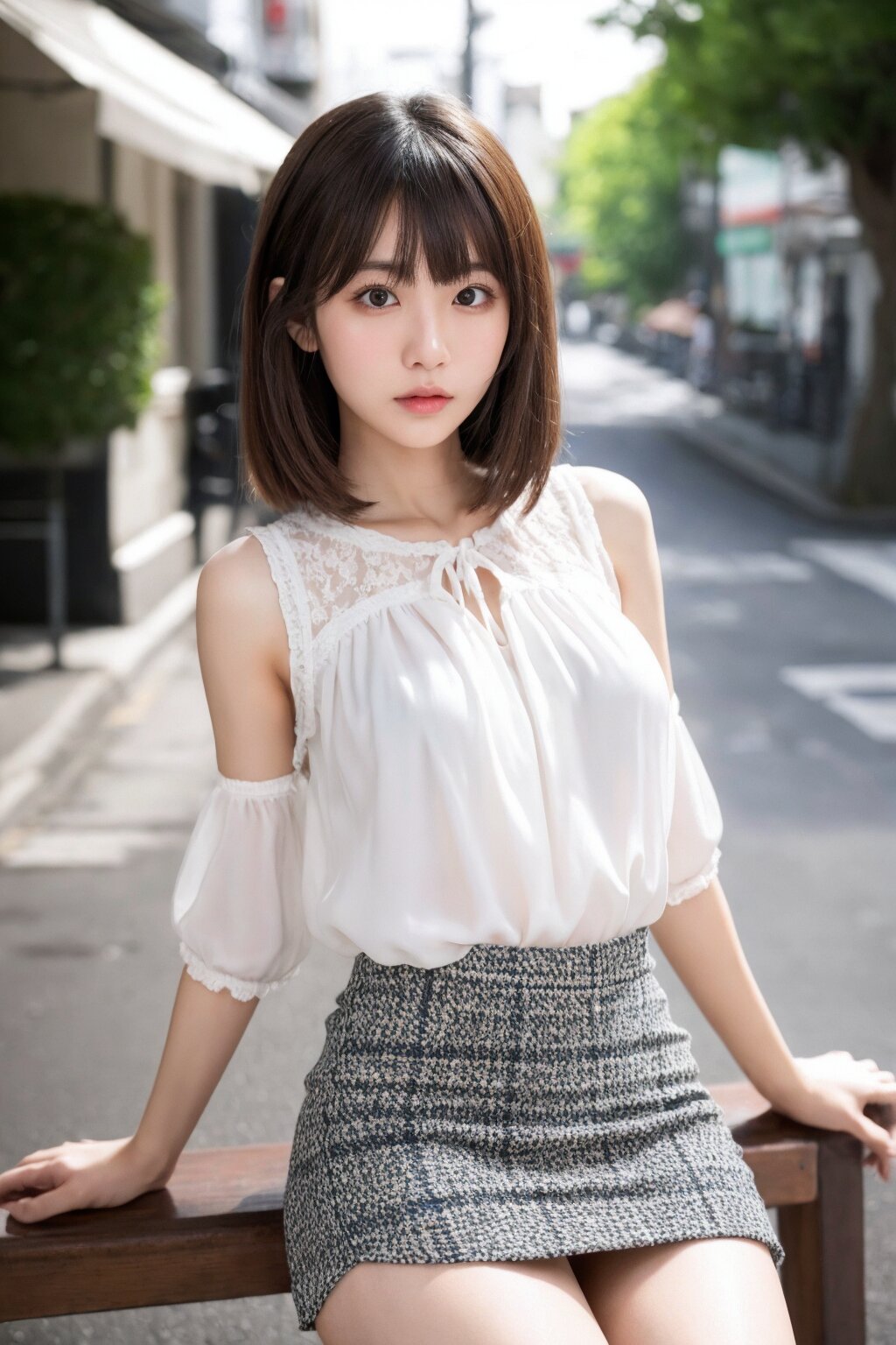 masterpiece, RAW photo, hyper detailed, 16K, extremely detailed CG, BREAK Japanese woman, 23yo, ((solo)), cute, pretty, hyper detailed eye, hyper detailed face, medium hair, bangs, extremely detailed, thin, tall, perfect anatomy, good proportion, extremely detailed body, perfect proportion, blouse,short skirt, extremely detailed blouse and skirt, BREAK sitting, hyper detailed background,