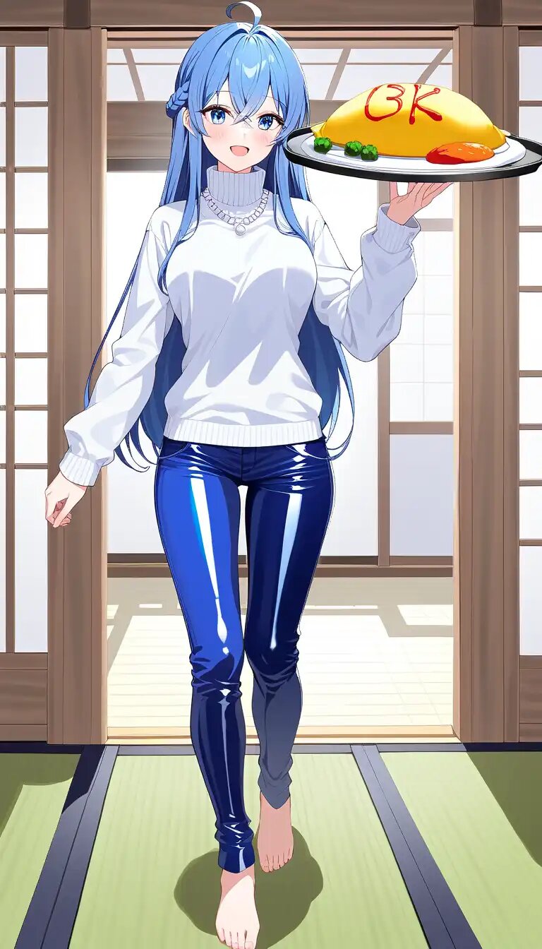 [masterpiece]++, [best quality]++, [ultra detailed]++, [8K]++, [holding tray]++, [Omurice on a plate]++, [full body]++,[turtleneck sweater]++, pearl necklace, long sleeves, [blue long denim]++, barefoot, [tall]++, [long hair]++, [straight hair]++, [shiny skin]++, [shiny clothes]++, [walking]++, standing, smile, blush, open mouth, Japanese-style room, shouji, tatami, day, indoors,
