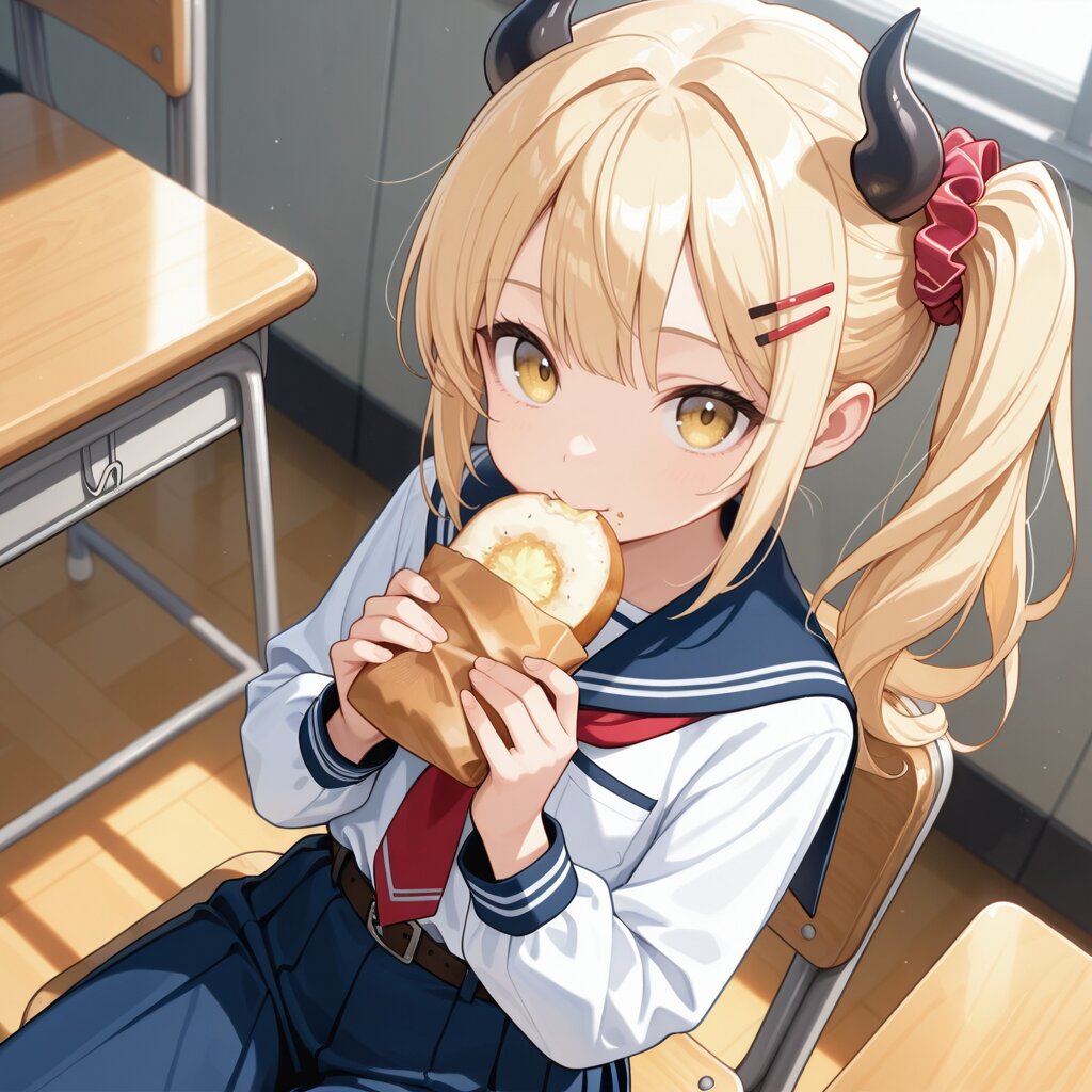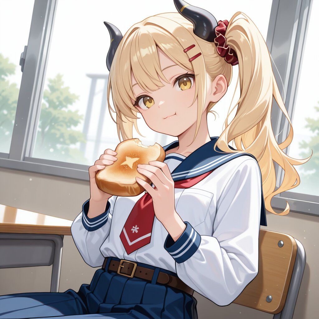 masterpiece,best quality,highres,ultra detailed,highly detailed,8k,general,1girl,solo,17yo,cute,(two demon horns,black horns,side ponytail),small breasts,long sleeves,blonde hair,long hair,bangs,hair scrunchie, hairclip,yellow eyes,light smile,closed mouth,demon girl,(long white serafuku,red part tie, long blue skirt,shirt tucked in,long blue pants),belt,slender girl,upper body, eating bread,holding bread both hands,in school,classroom, sitting school chair,looking at viewer,dutch angle,