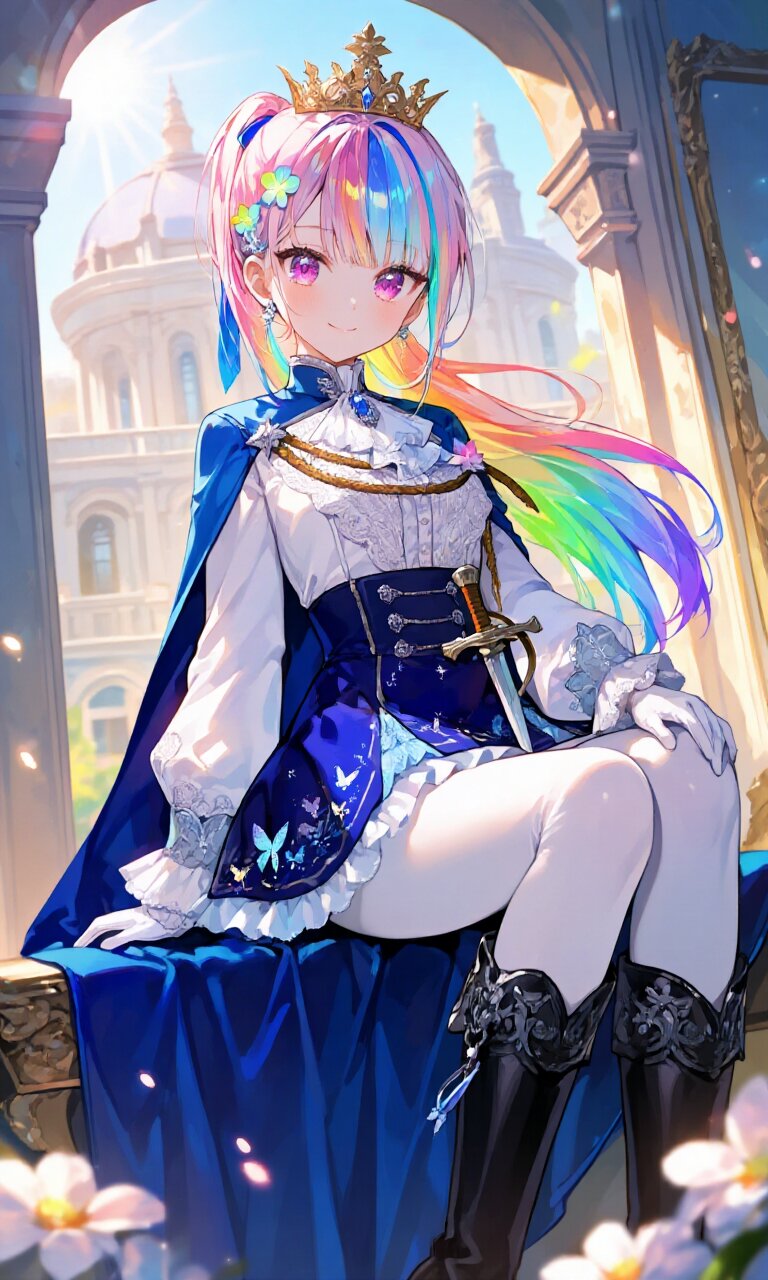 1girl, full body, portrait, solo, an 18-year-old girl with a cute, delicate, and detailed face, featuring sparkling purple eyes with a prismatic shine and big, beautiful eyes. She has flowing rainbow-colored hair tied in a loose ponytail, adorned with small glowing flower hair ornaments and soft glowing reflections, showcasing detailed and delicate strands. Her body is elegantly detailed, dressed in a (White luxurious prince costume with intricate lace:1.4), a (Medium Blue luxurious cape:1.2), and a (luxurious deep blue high waist mini skirt with subtle floral patterns embroidered with butterflies and sparkles, accented with White frills:1.4). She wears long sleeves, a (dagger on waist:1.3), a (luxurious crown on head:1.2), a white intricate lace jabot, and (luxurious White gloves:1.2). Her footwear consists of (Black luxurious Boots:1.3) and white tights. She poses (sitting on a luxurious chair:1.5) with her legs together, wearing a gentle smile. The background features a grand palace with Rococo architecture, bathed in afternoon sunlight with bloom effects, soft lighting, gentle backlight, floating light particles, and a soft-focus aesthetic. The image is rendered in a highly detailed illustration style with glossy shading and lens flare, evoking a romantic and chill atmosphere. The composition is intricate, with outstanding details and anti-aliasing for a polished finish.
