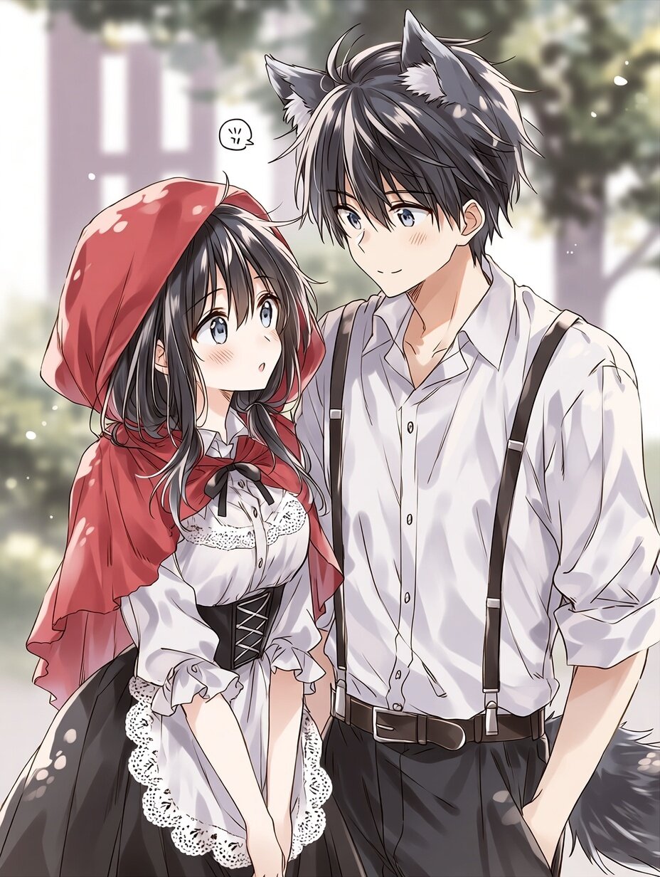 Illustration Prompt (concise & precise) A soft-romantic anime scene of an early-stage date: Red Riding Hood and a handsome wolf-eared man, shy chemistry, not yet official. Red Riding Hood: white blouse, black skirt, white lace apron; gentle, curious expression; subtle blush. Wolf-eared man: black hair, white shirt with suspenders; calm, protective demeanor; wolf ears visible but elegant. Mood: tentative closeness, exchanged glances, small smiles; hands almost touching. Setting: forest path or quiet town edge at dusk; warm light filtering through trees. Style: clean line art, soft lighting, pastel palette; cinematic depth of field; wholesome, fairy-tale modern vibe. --ar 3:4 --raw --stylize 750